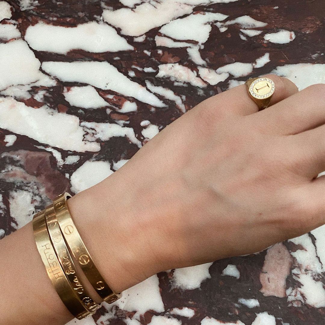 This version of the scarab signet ring is made of 18k yellow gold with 20 diamonds (or gems of your choice) circling the face. It can be inscribed with the initials, crest or numbers of your choice. The scarab beetles on the side reference Kaja's childhood memories of collecting turquoise Egyptian scarab beetle replicas from the Louvre gift shop with her brother over the years. In ancient Egypt, the scarab was used as a good luck charm that especially protected the heart, also symbolizing regeneration and rebirth. More recently, the Swiss psychoanalist Carl Jung evoked the scarab beetle as a motif of synchronicity in his groundbreaking book on the topic.