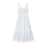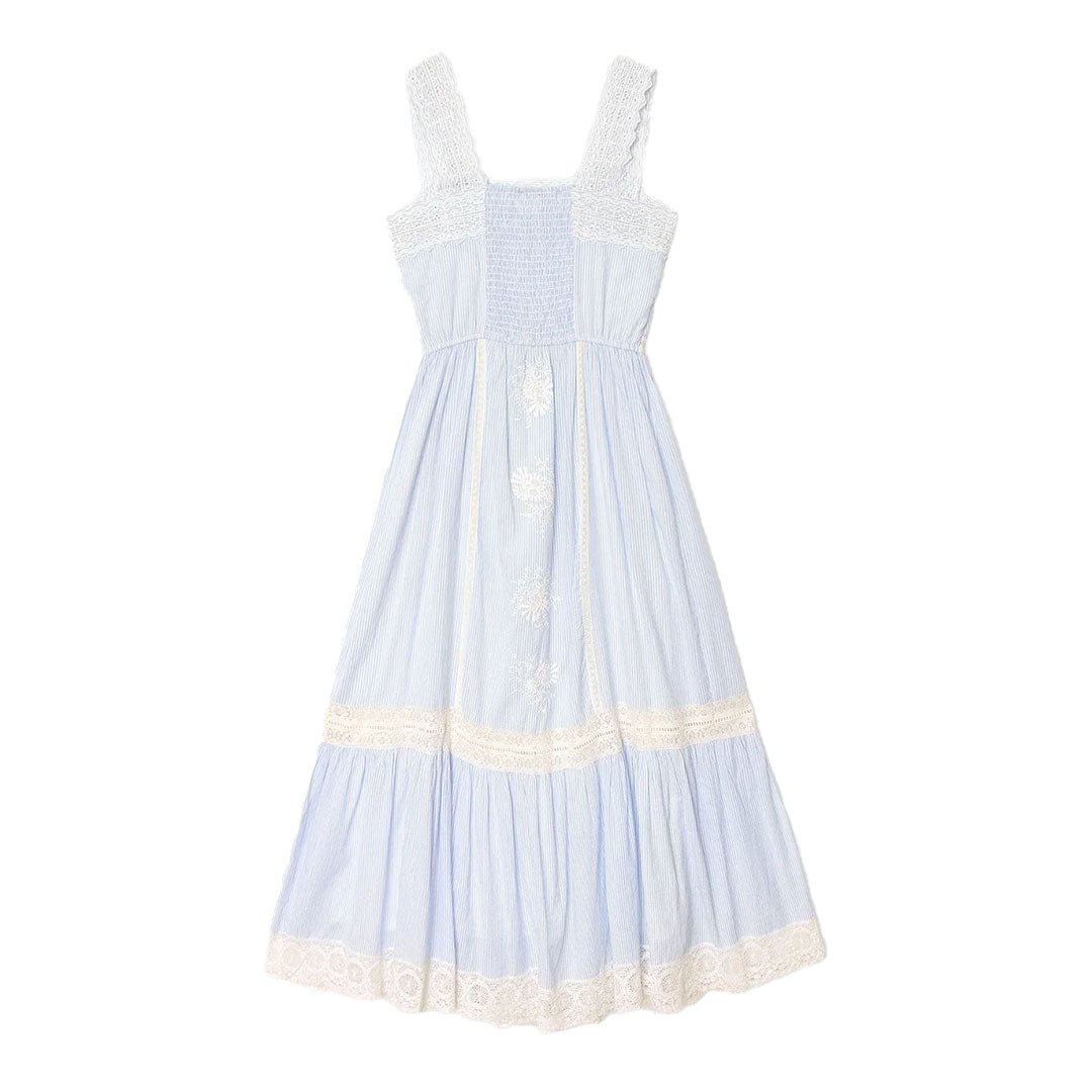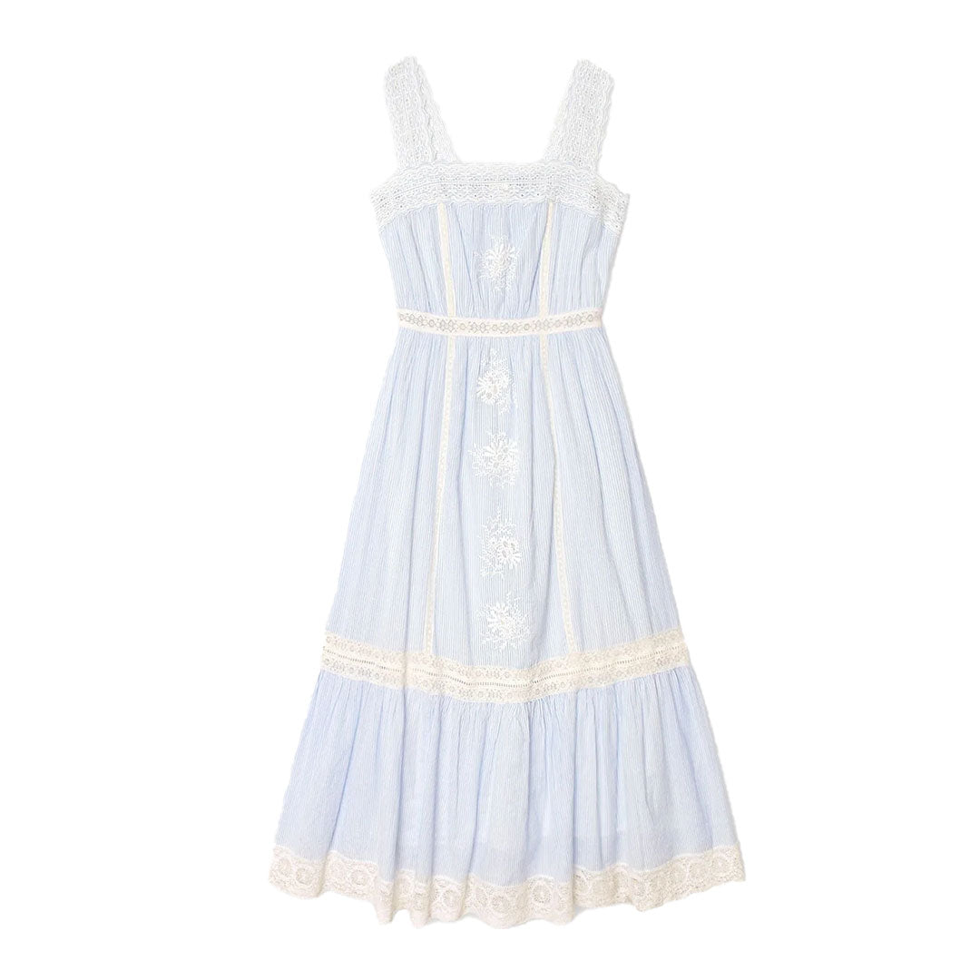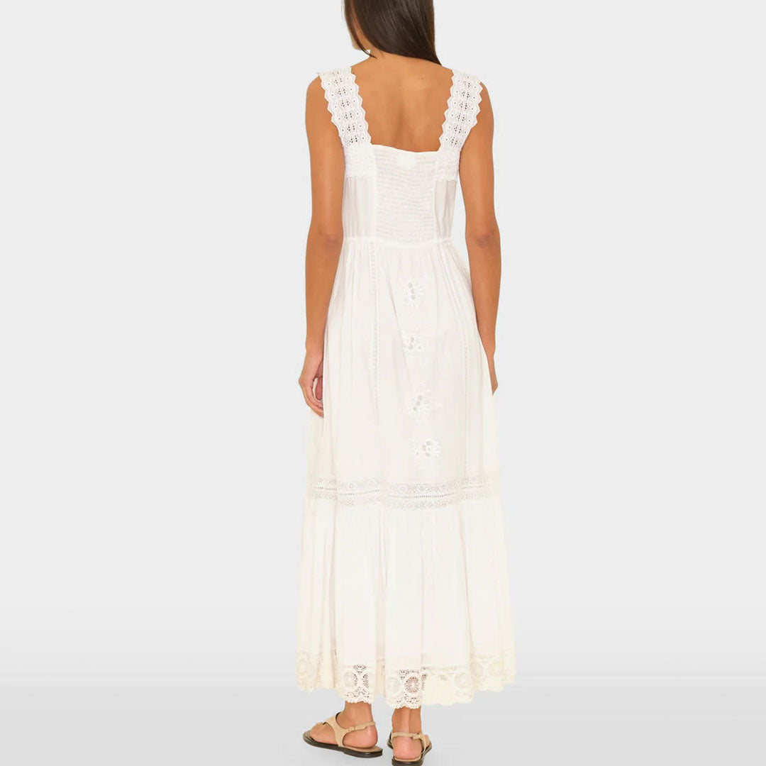 Delicate Details. Anita is new this season in Xirena's superfine cotton voile with a soft hand. This ultra-femme midi dress features eyelet straps, intricate embroidery, and lace trim throughout, finished with a ruffled hem and elasticized back.