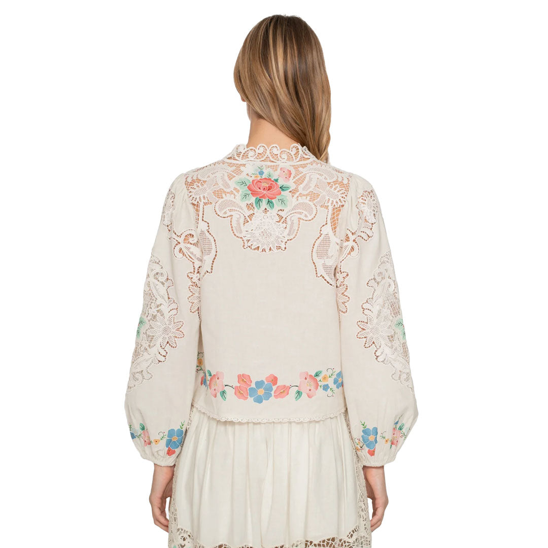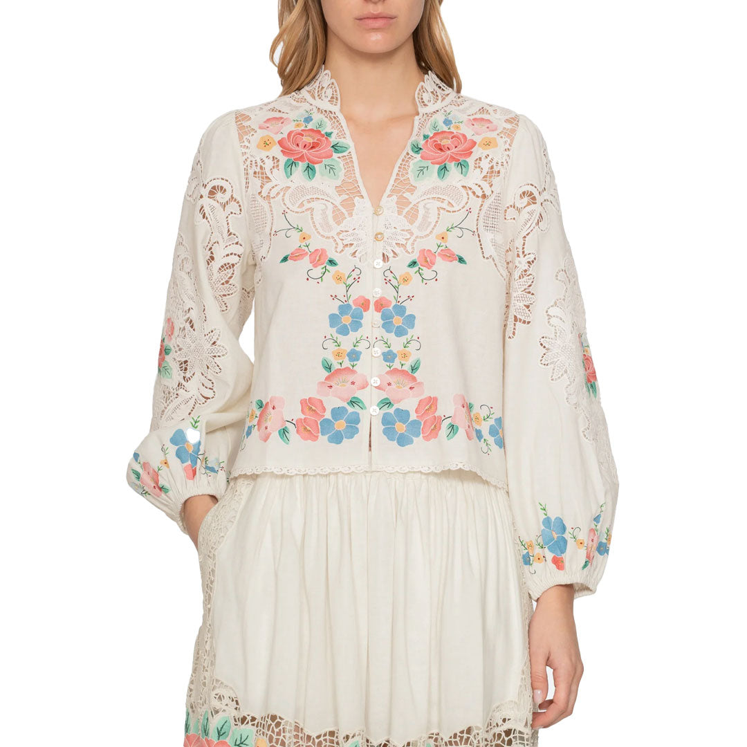 The Astrid embroidered blouse is adorned with intricate floral embroidery, colorful floral motifs, and features a button down front. Designed with long puff sleeves, it offers a romantic and effortlessly feminine silhouette.