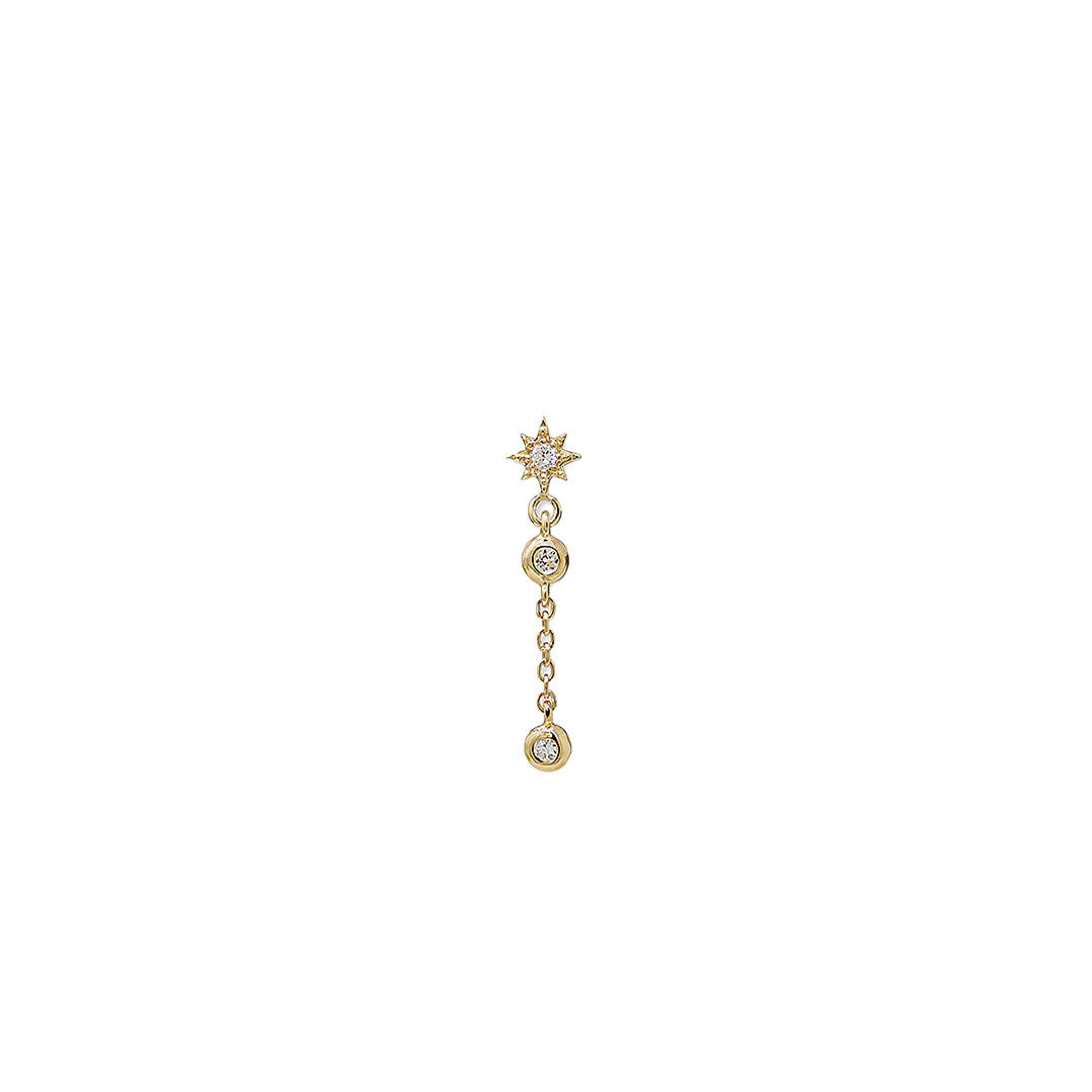 A gemstone centered starburst is delicately mounted on a gold post alongside diamond bezel set cascade chains.
