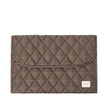 Quilted laptop sleeve in brushed leopard and brown and black check nylon. Features an exterior zip pocket, cotton logo patch, and Velcro flap closure.
