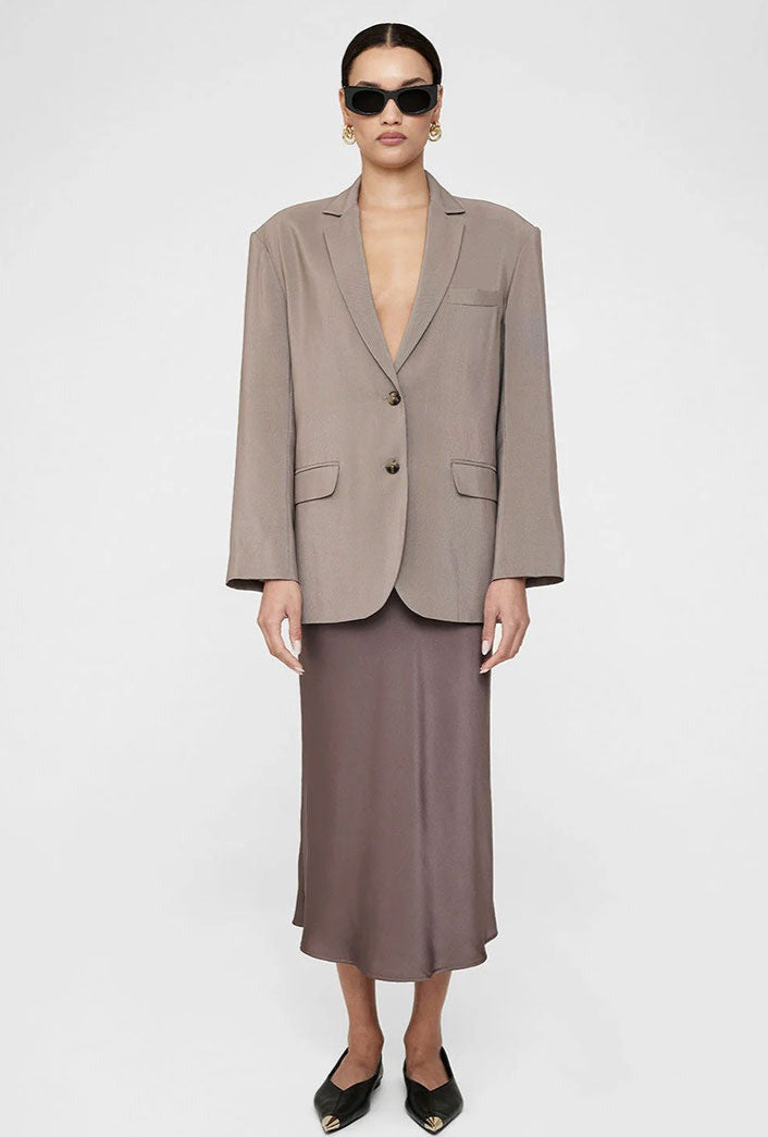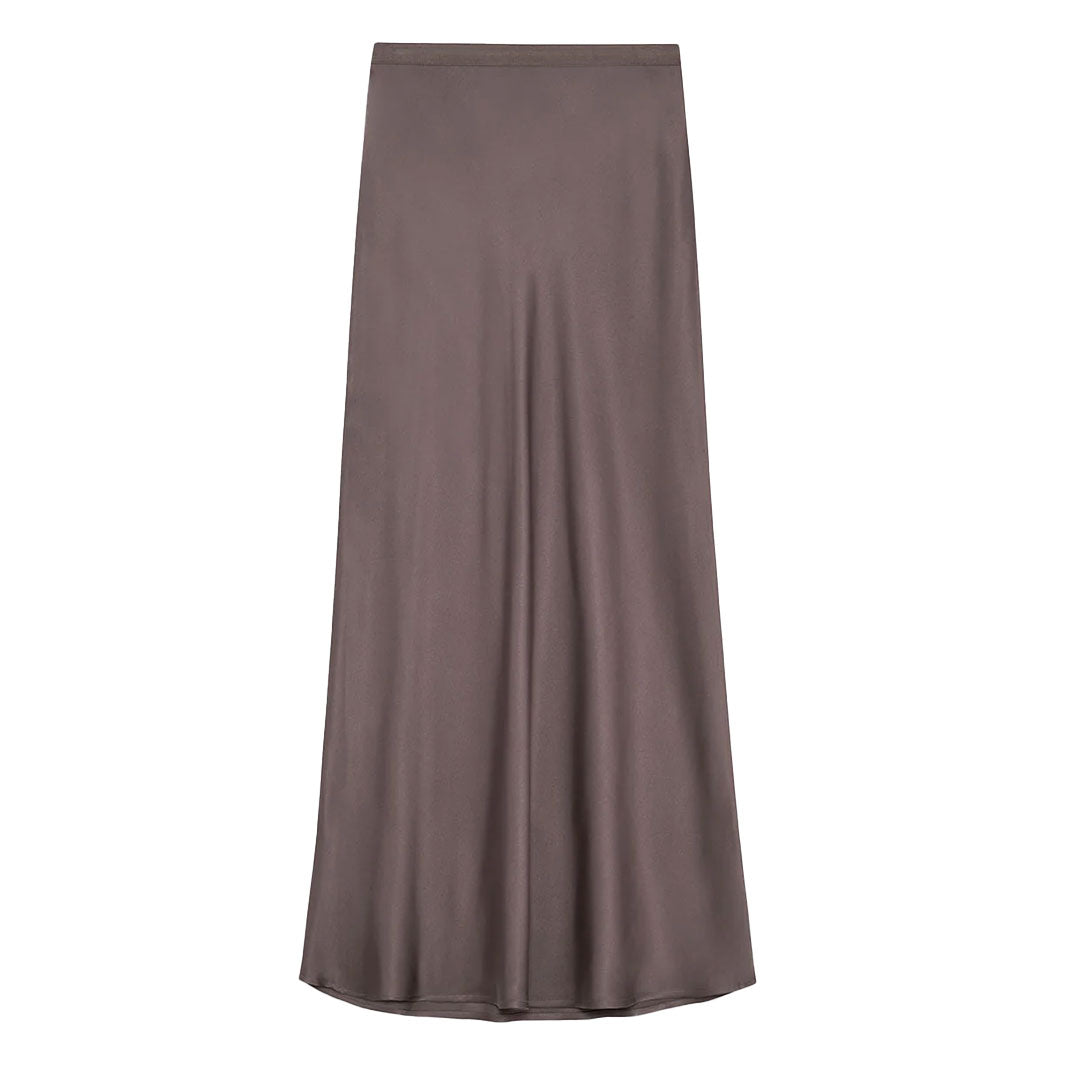 The best-selling Bar Silk Skirt in iron is made from 25 mm double-faced silk charmeuse cut on the bias for a smooth silhouette that sits high at the waist and hugs the body through the hips. This style features an elasticated waistband for a comfortable, pull-on construction.