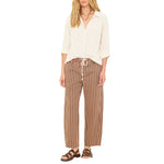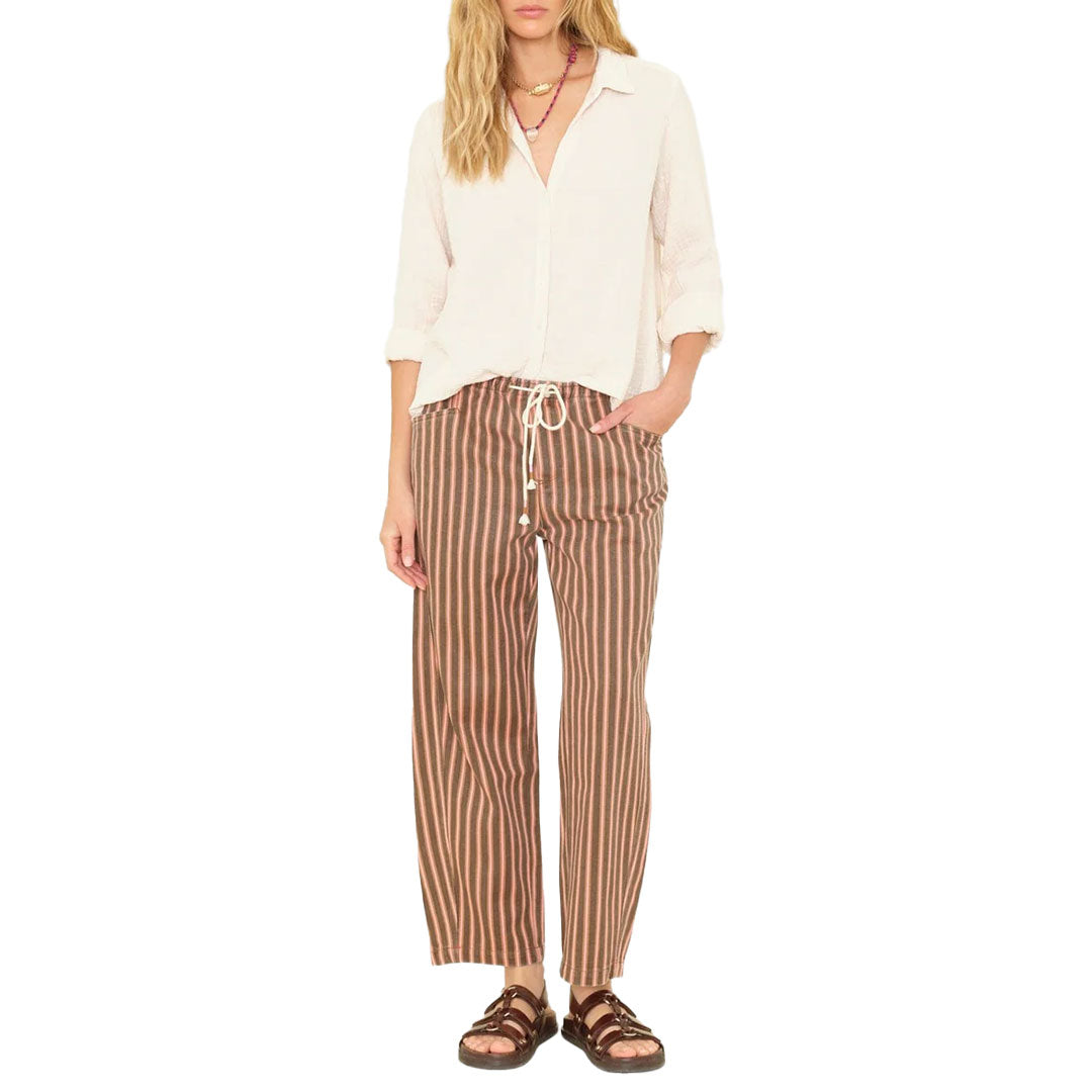 Denim Days. Baxter is updated this season in our multicolor striped lyocell denim. This slightly cropped pull on pant features an elasticized drawstring waist with rope cord detail, front square pockets, flap back pockets with button closure, and a subtle barrel leg.