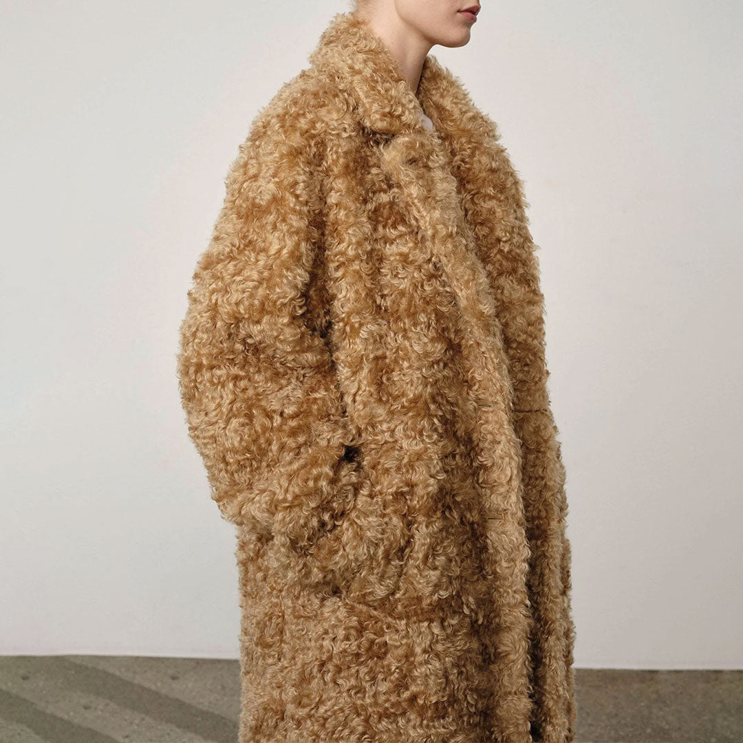 Introducing the Bruce Coat: A long and voluminous coat with dropped shoulders, featuring slanted paspel pockets at the front and crafted from RMS Mohair.