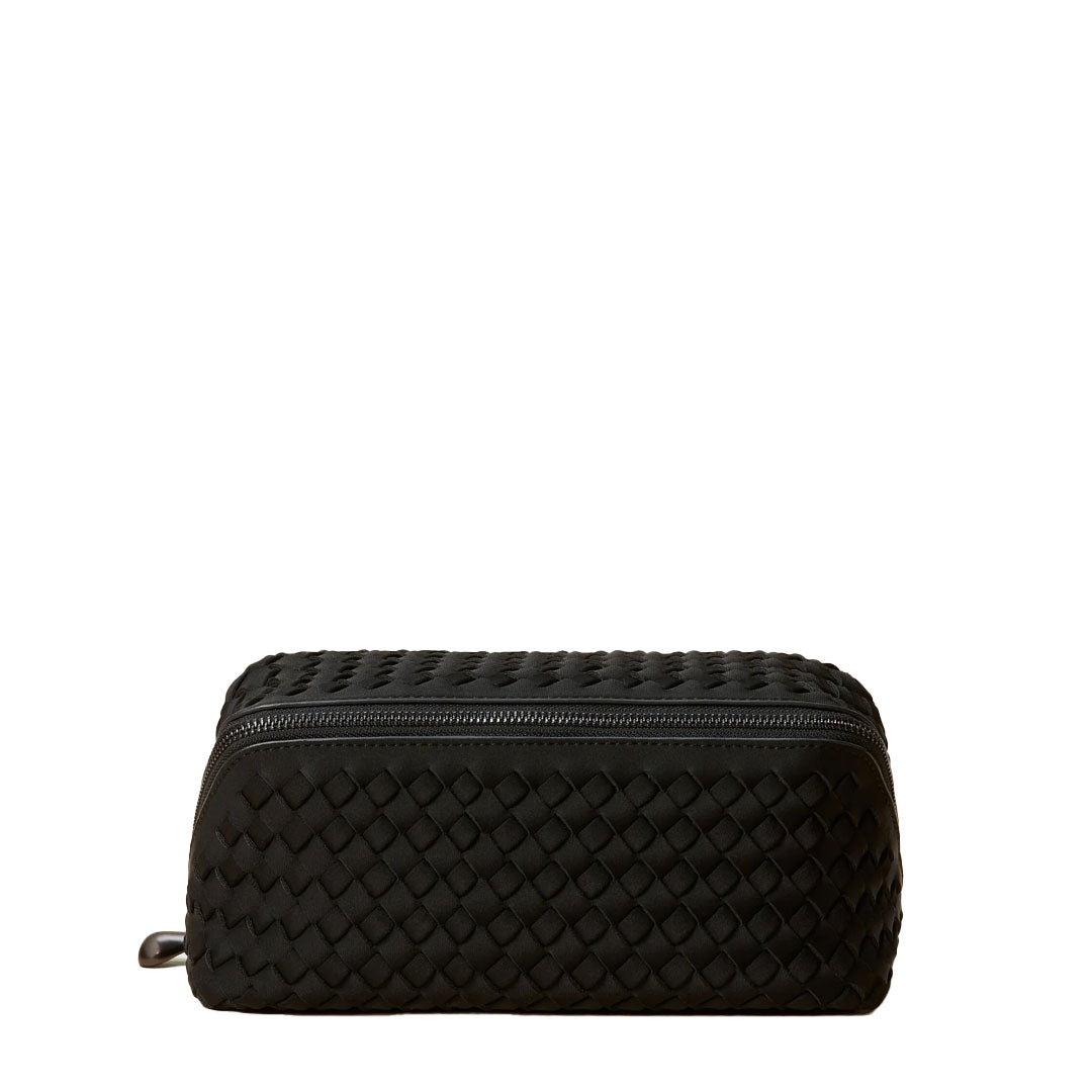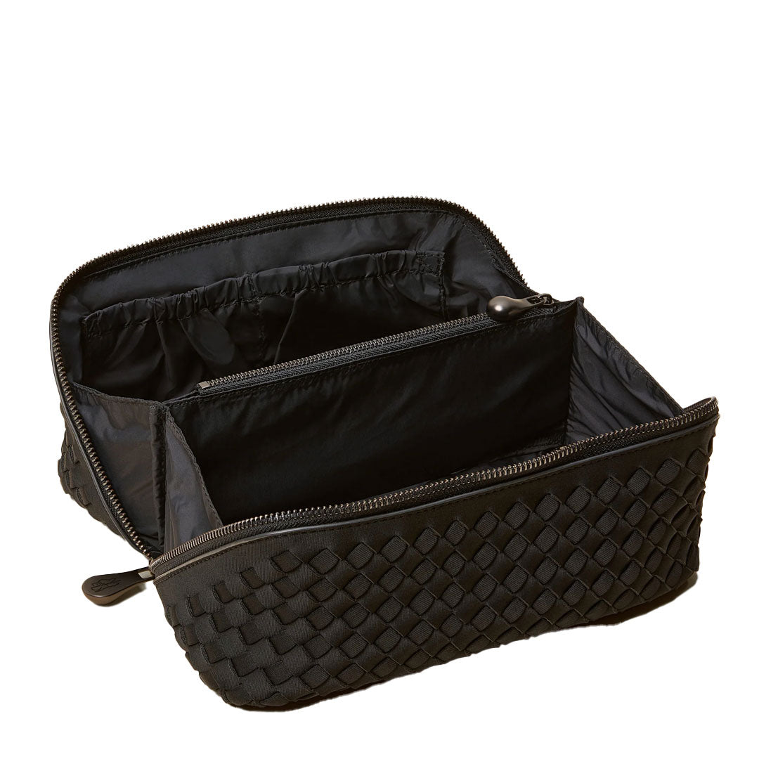 Handwoven from our signature neoprene in true black, the Caravan Medium Cosmetic Case is a must-have travel makeup bag and toiletry case. With a structured silhouette and roomy interior, it features a secure zipper closure, a center zippered pocket, and four open compartments to keep your essentials organized. Spacious enough for a multi-day trip yet sleek enough to pack as carry-on toiletry bag, this woven neoprene cosmetic case makes travel effortless.