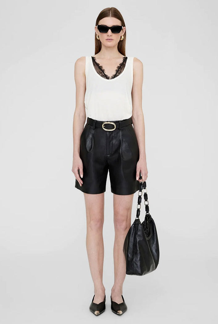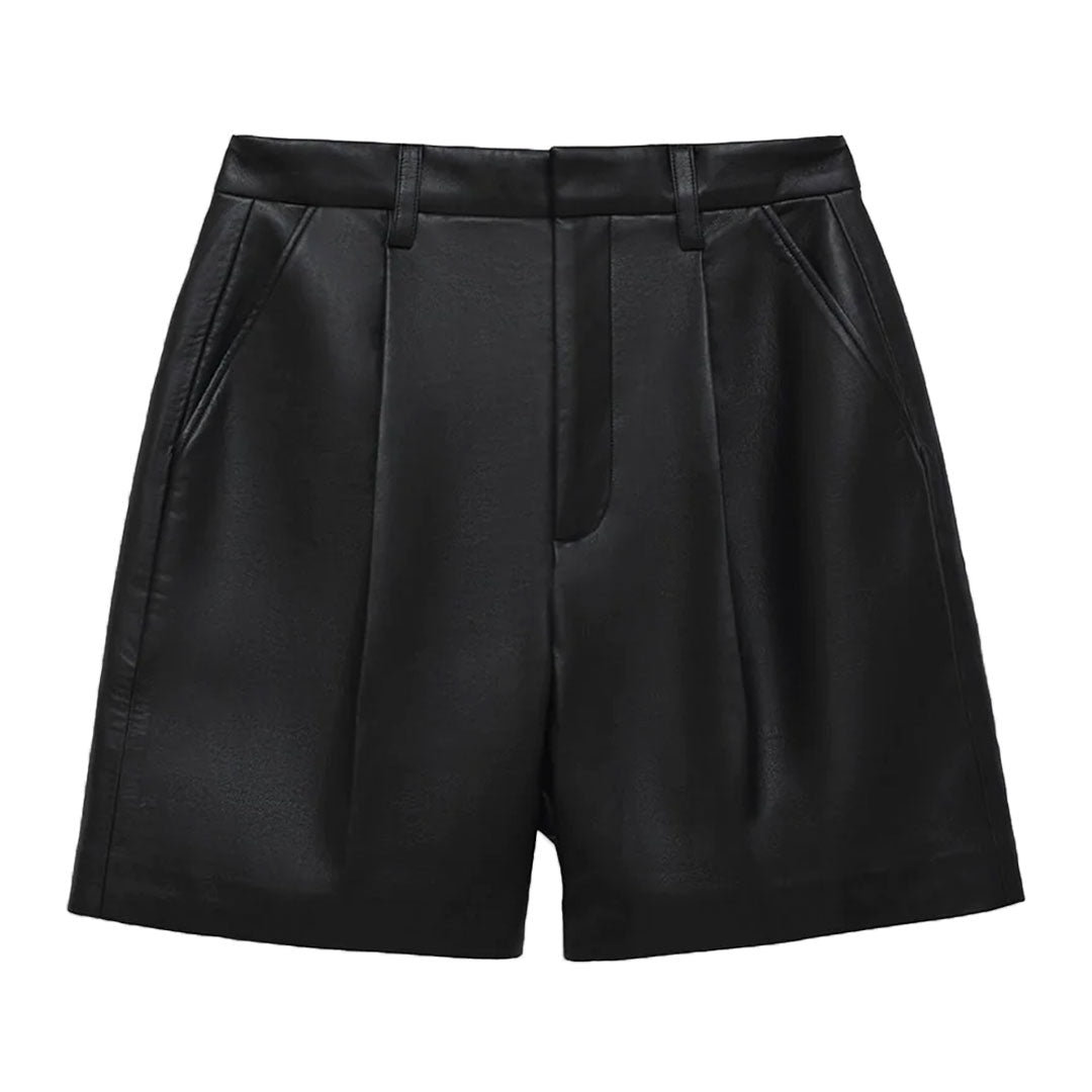 The Carmen Short is a timeless bottom crafted from 100% regenerated leather, fully lined for a soft-yet-structured silhouette. This style features pleated front detailing, five functional belt loops, two back welt pockets, slanted front pockets, and a front zip opening with a hook and bar closure for a clean finish.