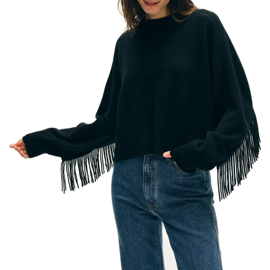 Elevate your knitwear collection with this refined statement piece. Crafted in a plush wool-cashmere blend for exceptional softness and drape, the Luxe Fringe Crew blends timeless luxury with edgy texture. Hand-applied fringe detailing cascades along the arms and back, creating subtle movement and a distinctive silhouette. With a relaxed crew neckline and slightly boxy yet polished shape, this sweater pairs effortlessly with tailored trousers, elevated denim or a sleek midi skirt.