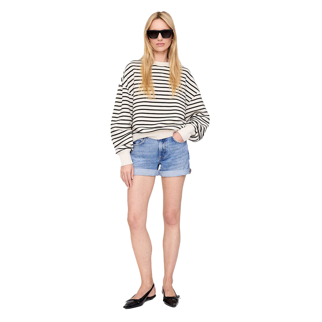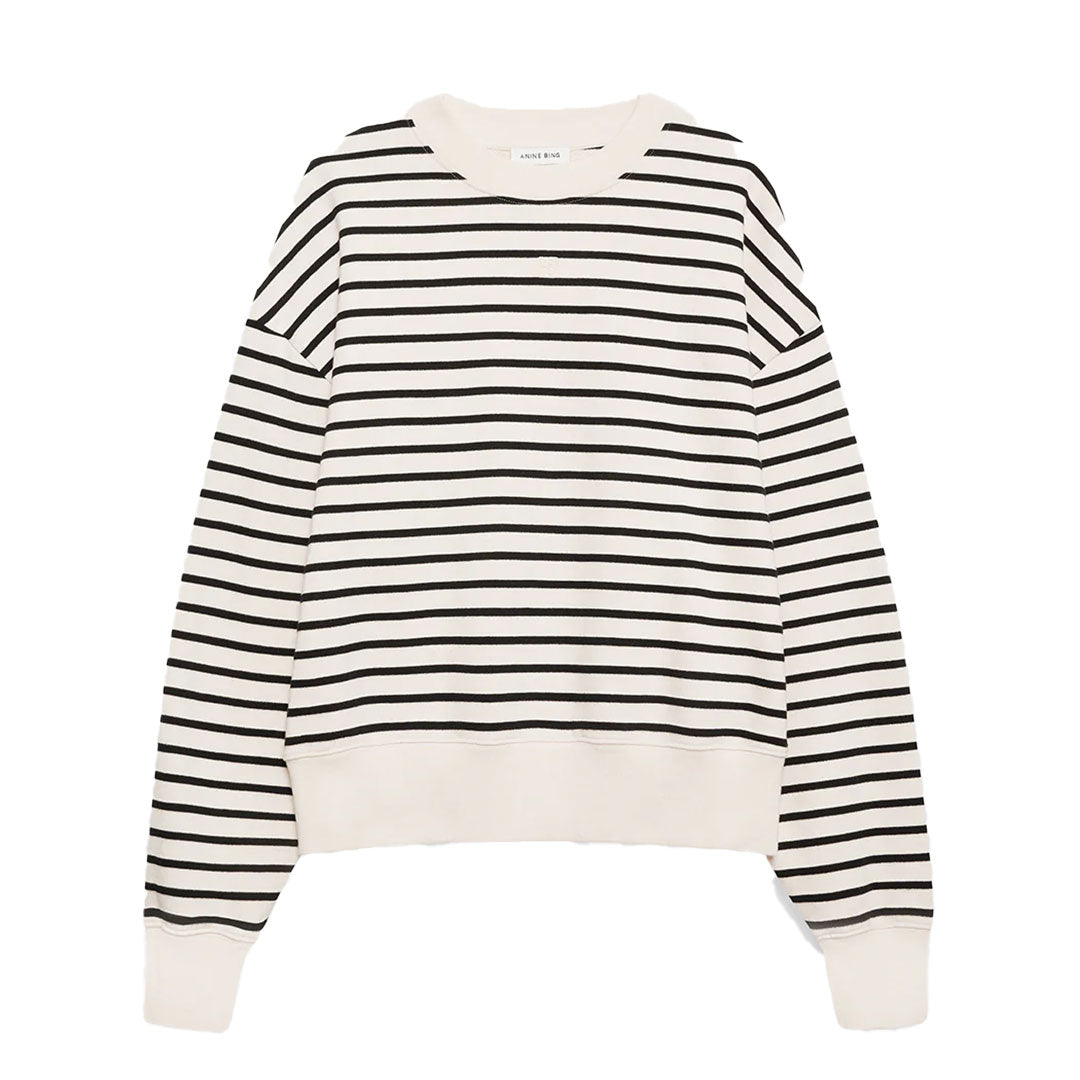 The Dean Sweatshirt is a relaxed crewneck pullover made from a midweight cotton French terry fabrication with black and white Breton stripes.