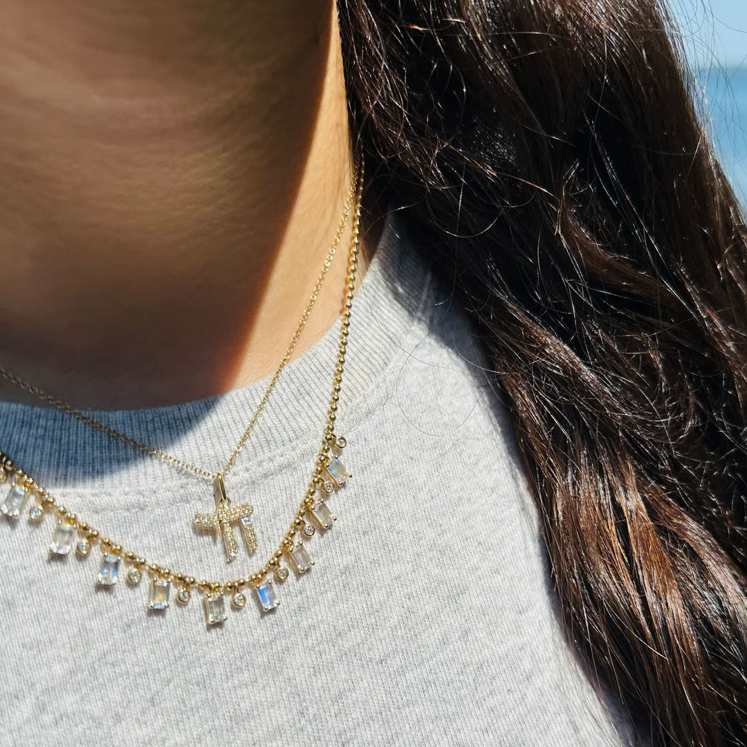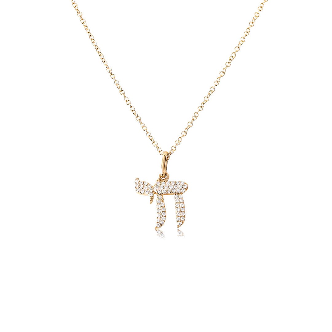 A stunning diamond and 14K gold Chai necklace. The Chai necklace is a popular piece of jewelry in Jewish culture, symbolizing "life" in Hebrew. It serves as a reminder of the value and significance of life. The necklace typically showcases the two Hebrew letters "chet" (ח) and "yud" (י), which together spell "chai."