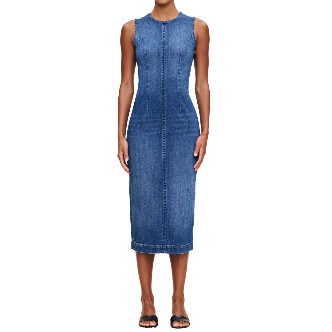 Esme is a form-fitting, sleeveless midi dress with hidden zippers at the back neck and side.