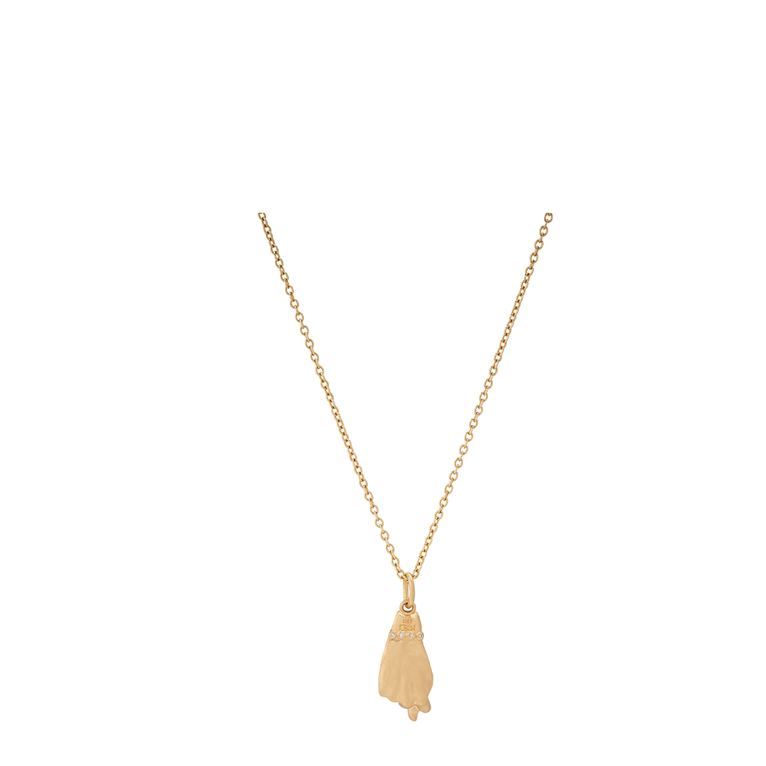 The Figa Mano is made of 18k yellow gold with diamonds encircling the wrist. The gesture of the hand with the closed fist likely originates in Etruscan Italy, where it symbolized fertility and pleasure. The figa hand began to appear in South America in the 17th century, where it was adopted as a protective symbol to ward off jealousy and the evil eye. Wear it as a reminder that we all carry our own luck around with us everyday.