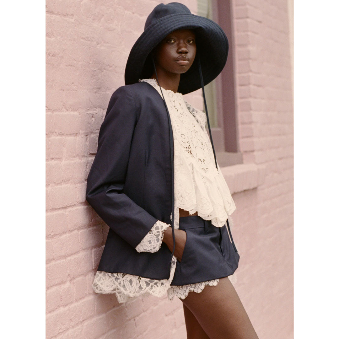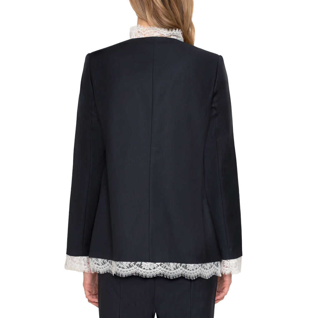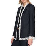 The Fiora tropical wool jacket reimagines a classic blazer silhouette with intricate floral lace trim throughout, offering a balance of structure and feminine detail.
