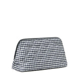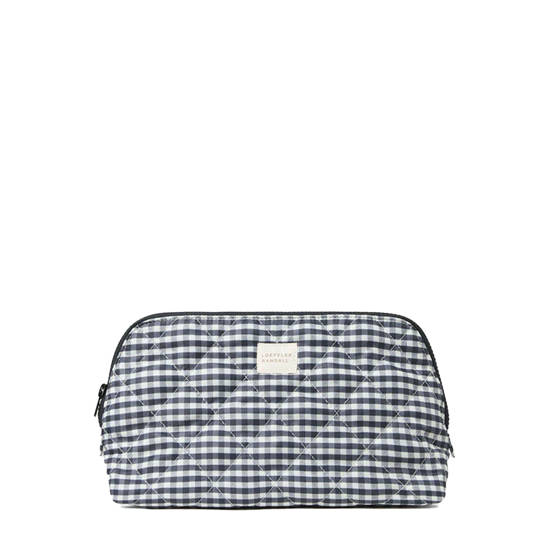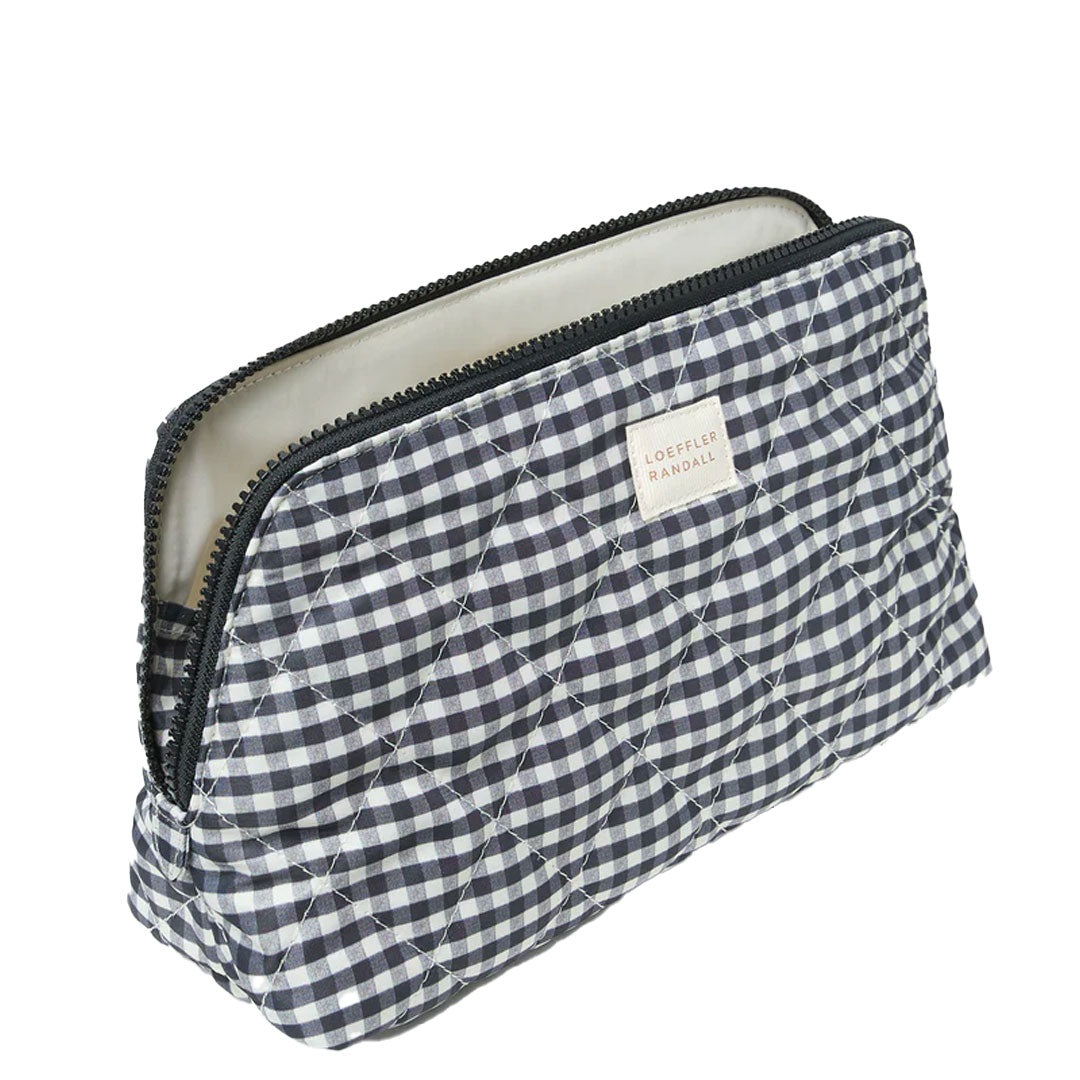 Quilted cosmetic pouch in black and white gingham cotton-silk fabric. Features an exterior cotton logo and a top-zip closure, perfect for travel.
