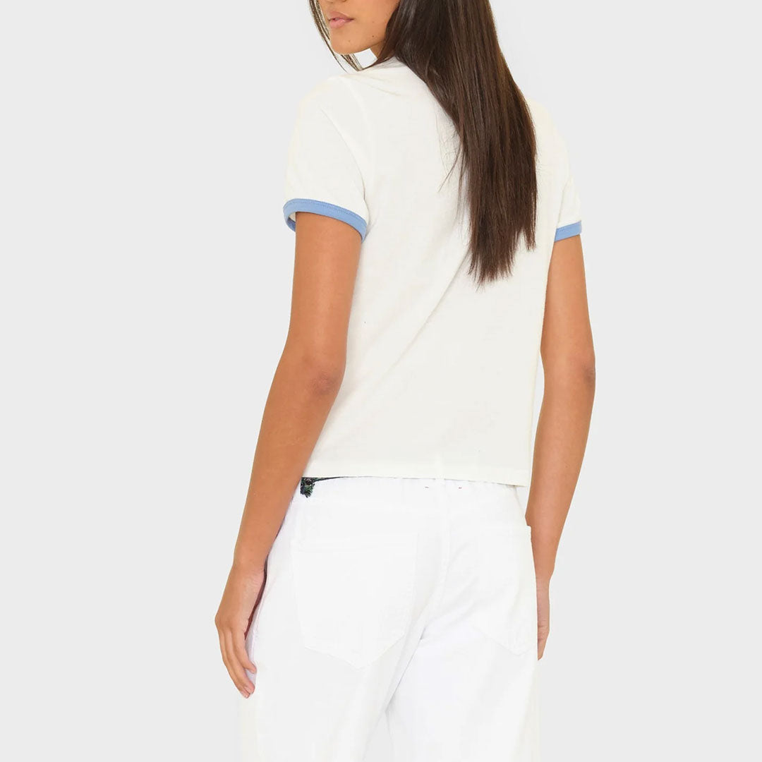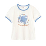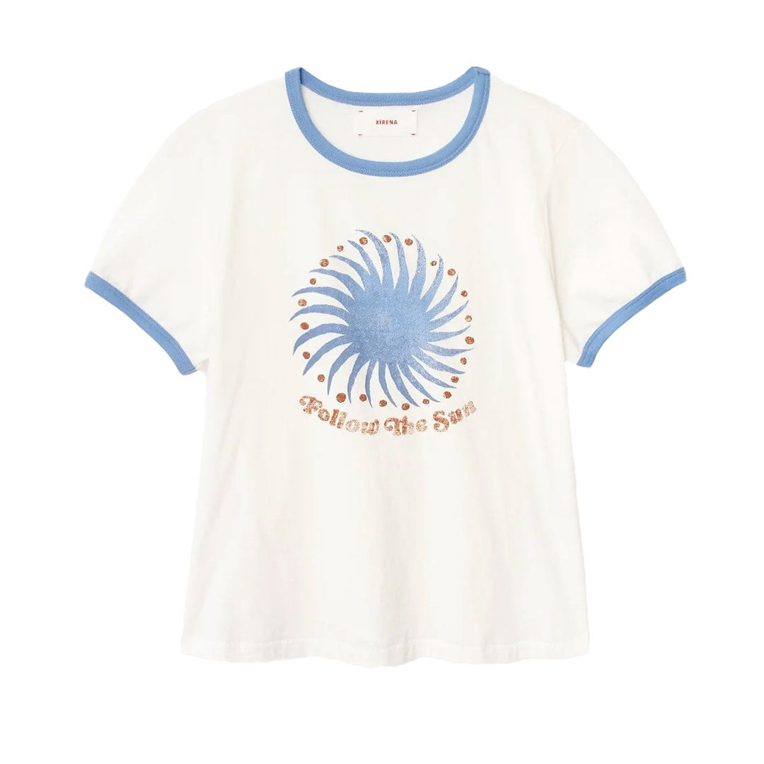 Sun Days. Frankie is made in our ultra-soft cotton jersey. This bestselling ringer tee features contrast colour binding and a “Follow the Sun” graphic.