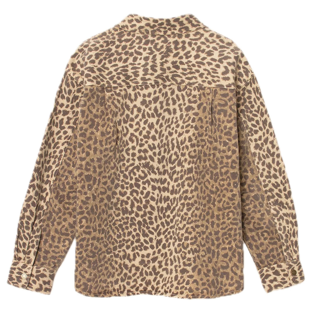 This relaxed button-front shirt features metal snap buttons, spread collar, drop shoulders, and a back yoke.