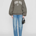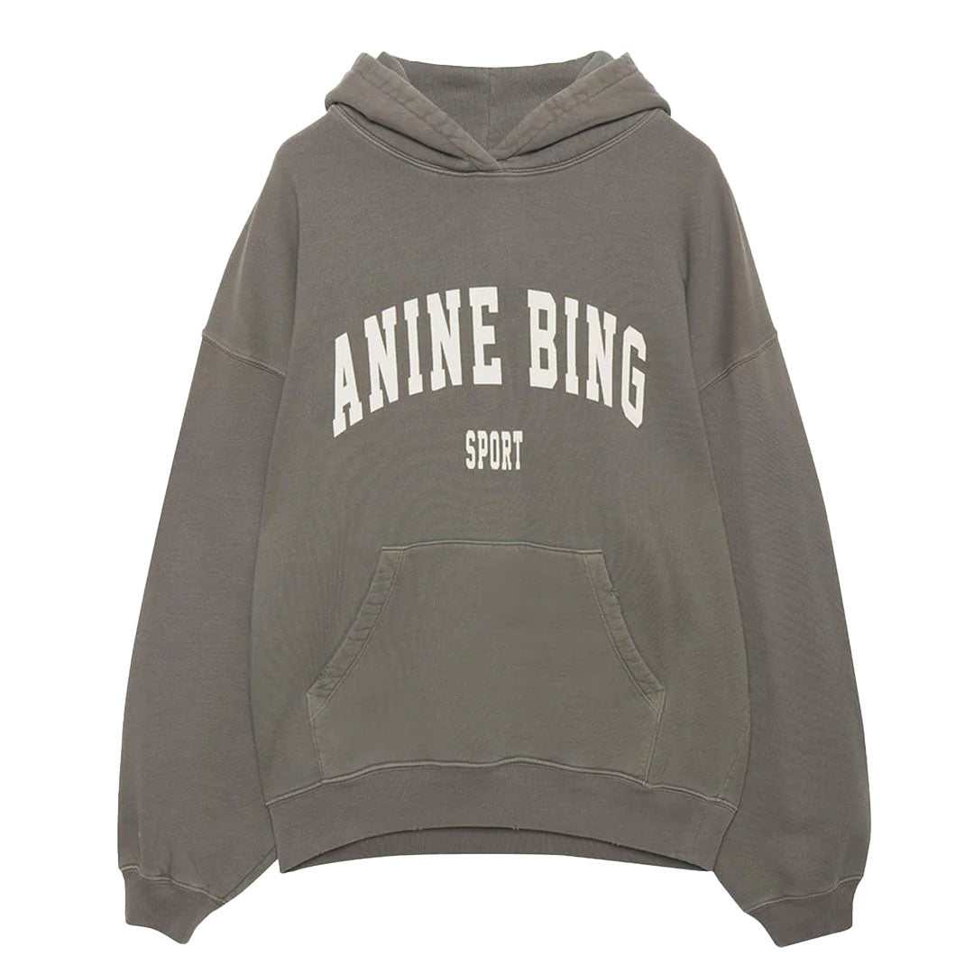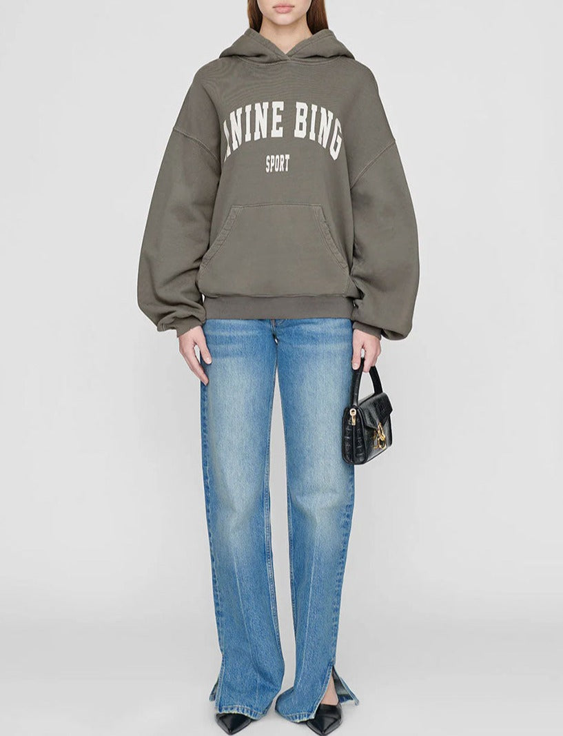 The Harvey Sweatshirt is an oversized hoodie made from our signature cotton-fleece blend in a dusty olive colorway that’s comfortable and lightweight. It features a screen-printed ANINE BING Sport graphic at the chest in cream collegiate-inspired lettering and subtle grinding along the edges of its hood, sleeve cuffs, and waistband for a vintage look. Includes a functional front kangaroo pocket.