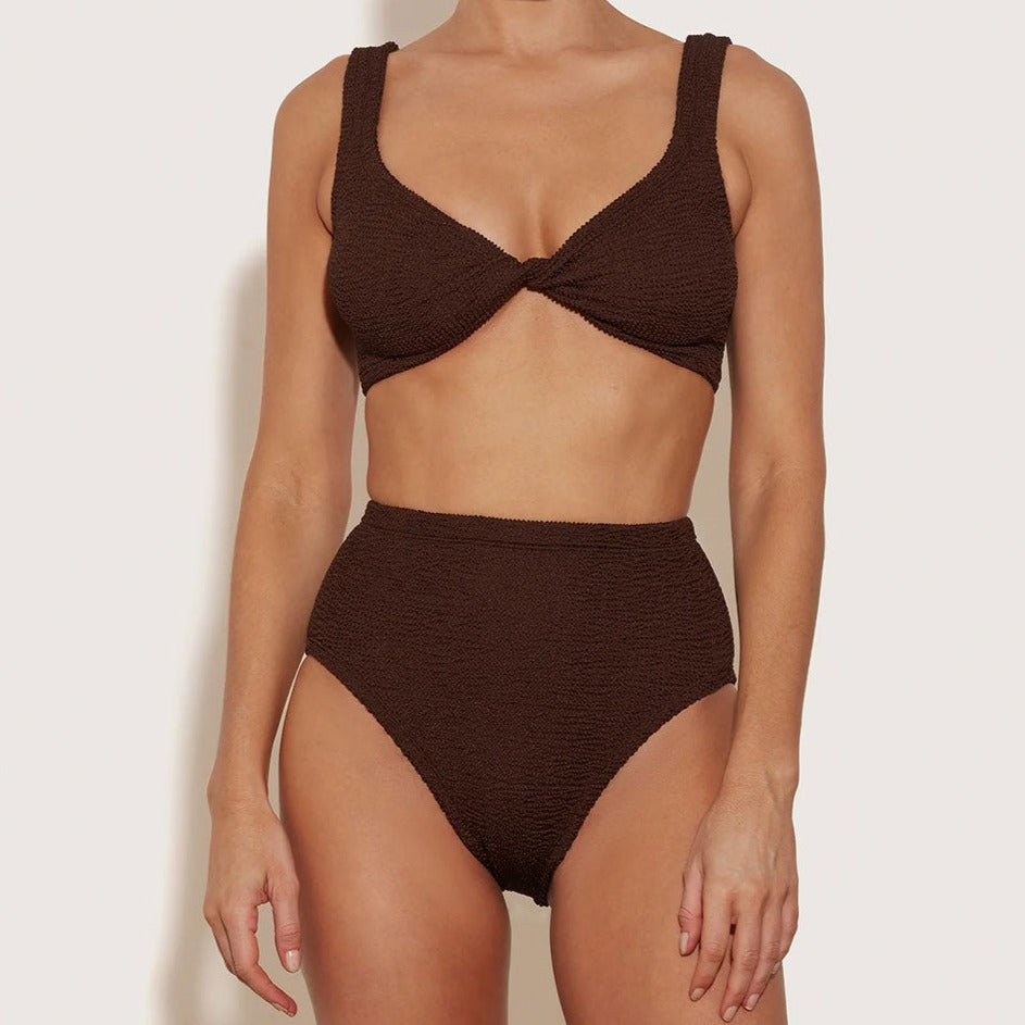 Hunza G took two of their best-selling bikinis, the Juno and Nadine, and combined them to make the ultimate elevated addition to your swim capsule. Comfort and style meet with Jamie.