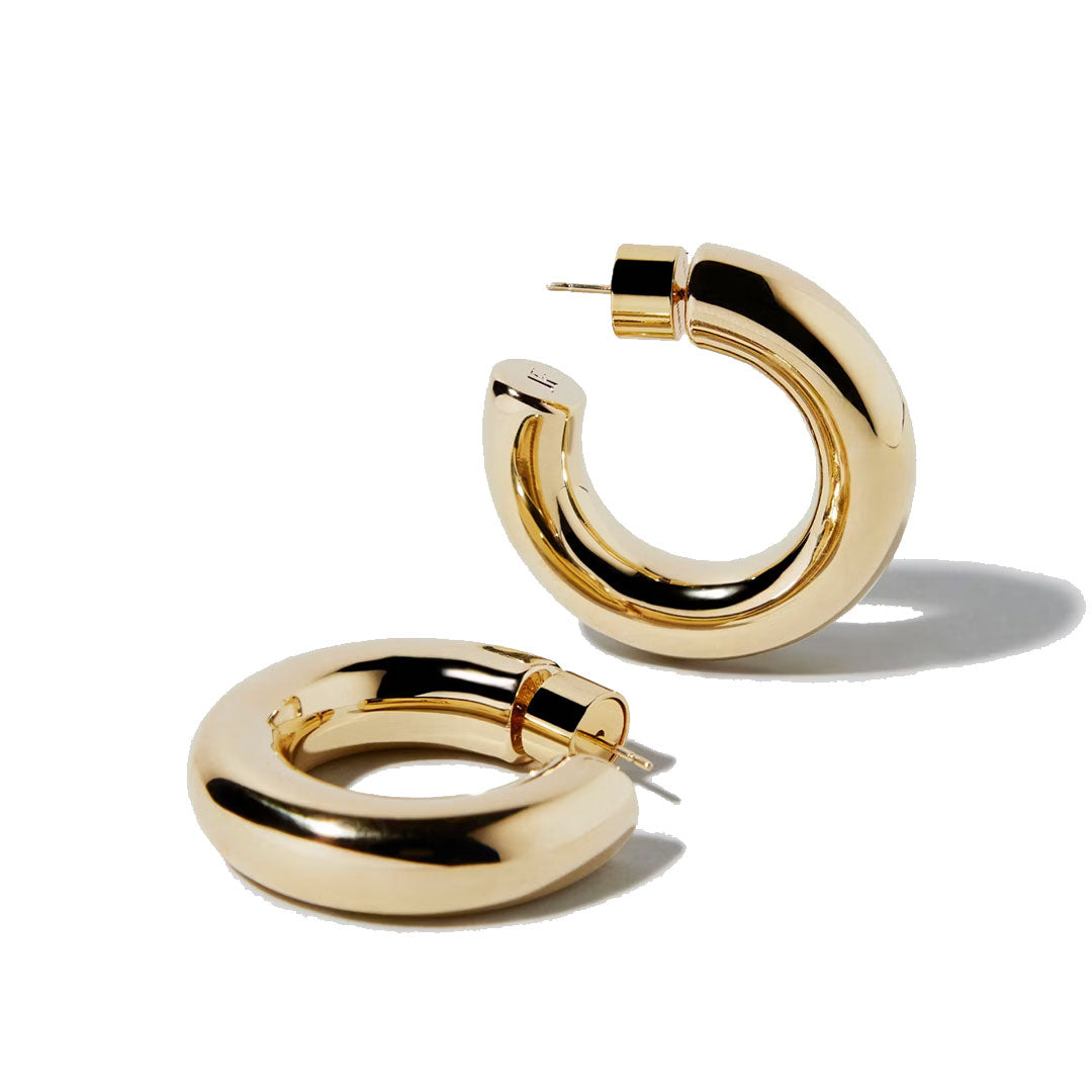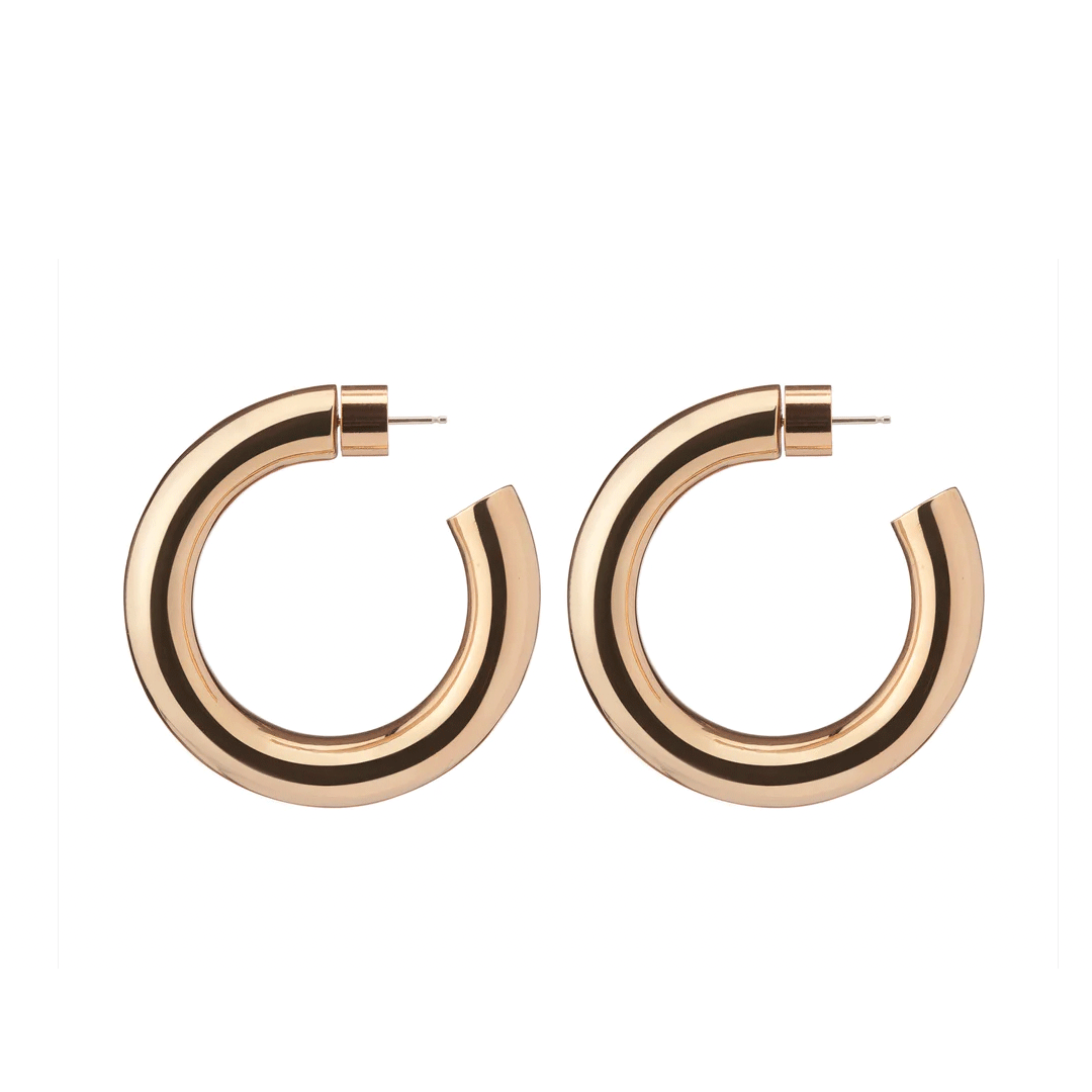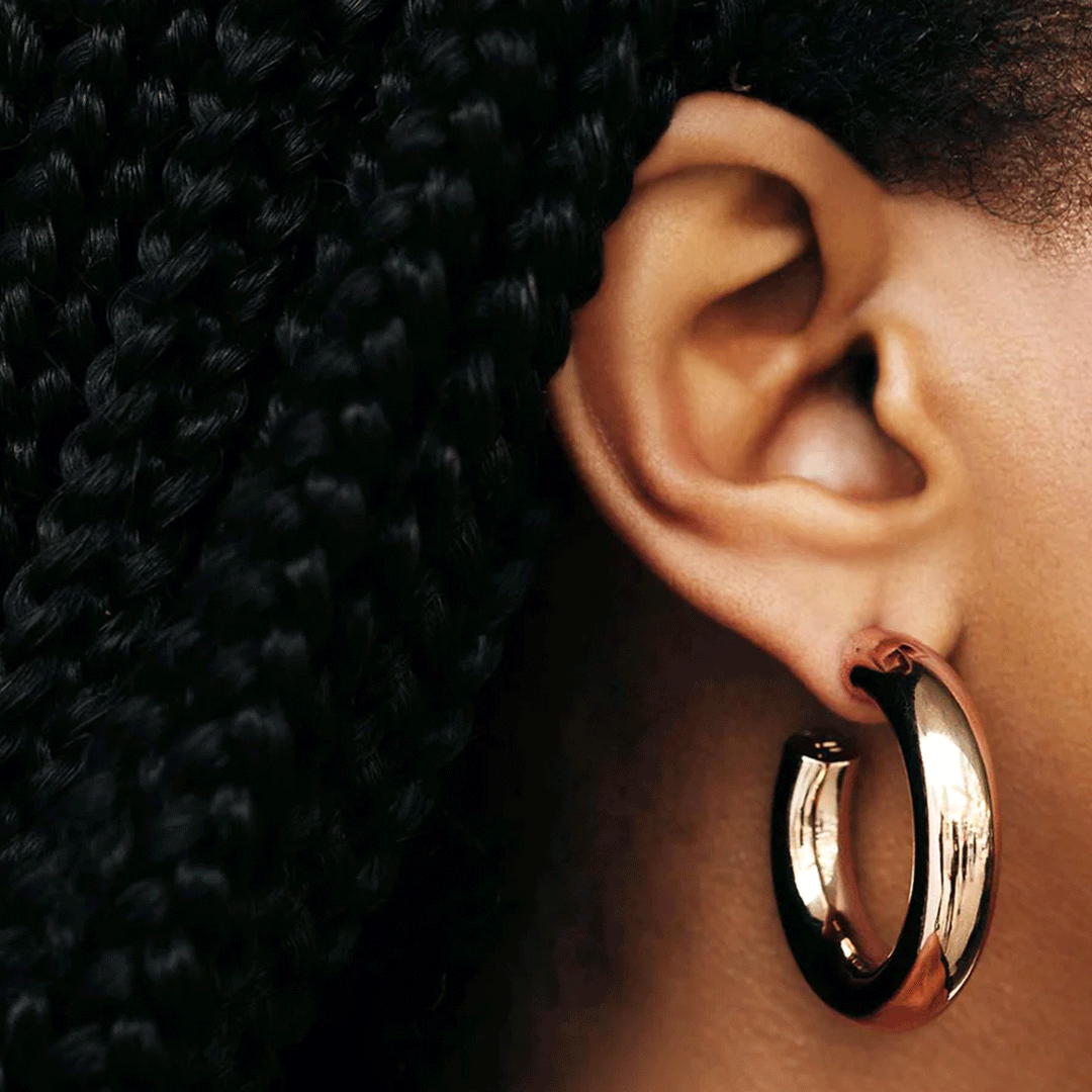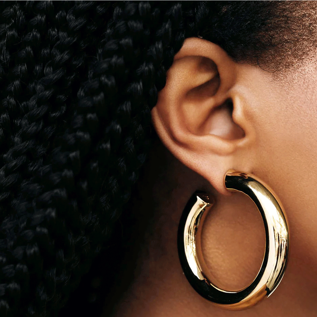 The Jamma Hoops, when you feel like nothing else is thick or big enough. Especially designed to ensure balance, these hoops are hollow, incredibly light and easy to wear. Sold as a pair.