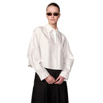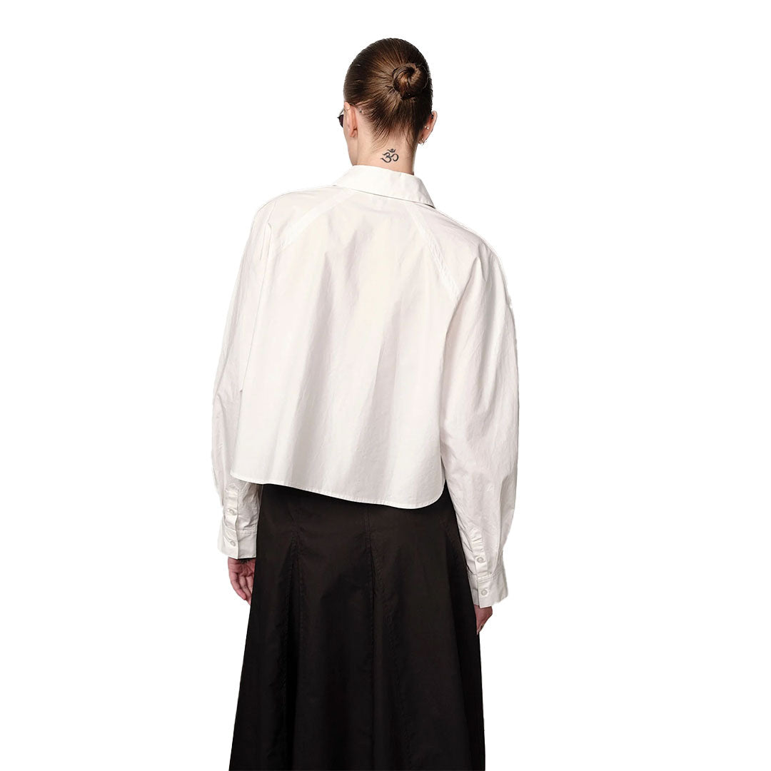 A classic cotton shirt reimagined in a cropped, slightly oversized silhouette. The crisp poplin fabric ensures effortless sophistication, balancing sharp tailoring with a modern proportion.