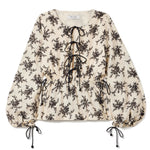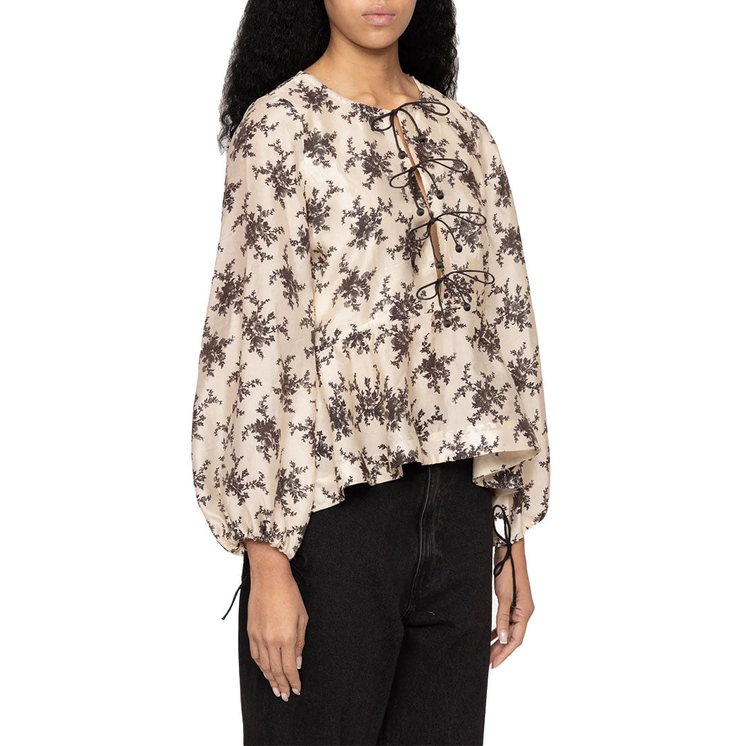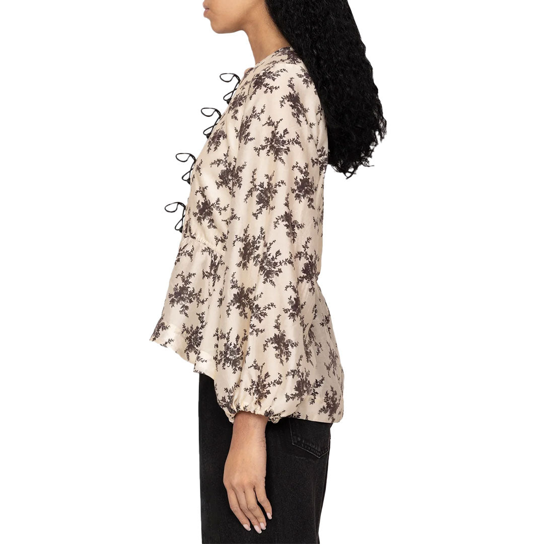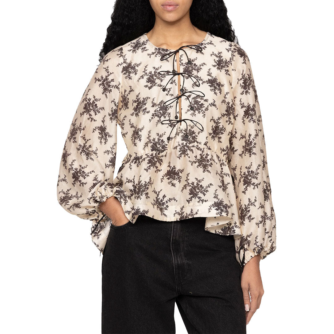 The Joan floral print top features long voluminous puff sleeves and delicate front tie closures that add a romantic touch. Finished with a flattering peplum hem, this top pairs timeless charm with an effortlessly elegant silhouette.