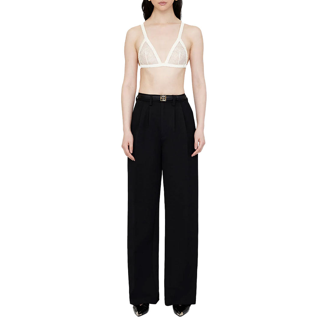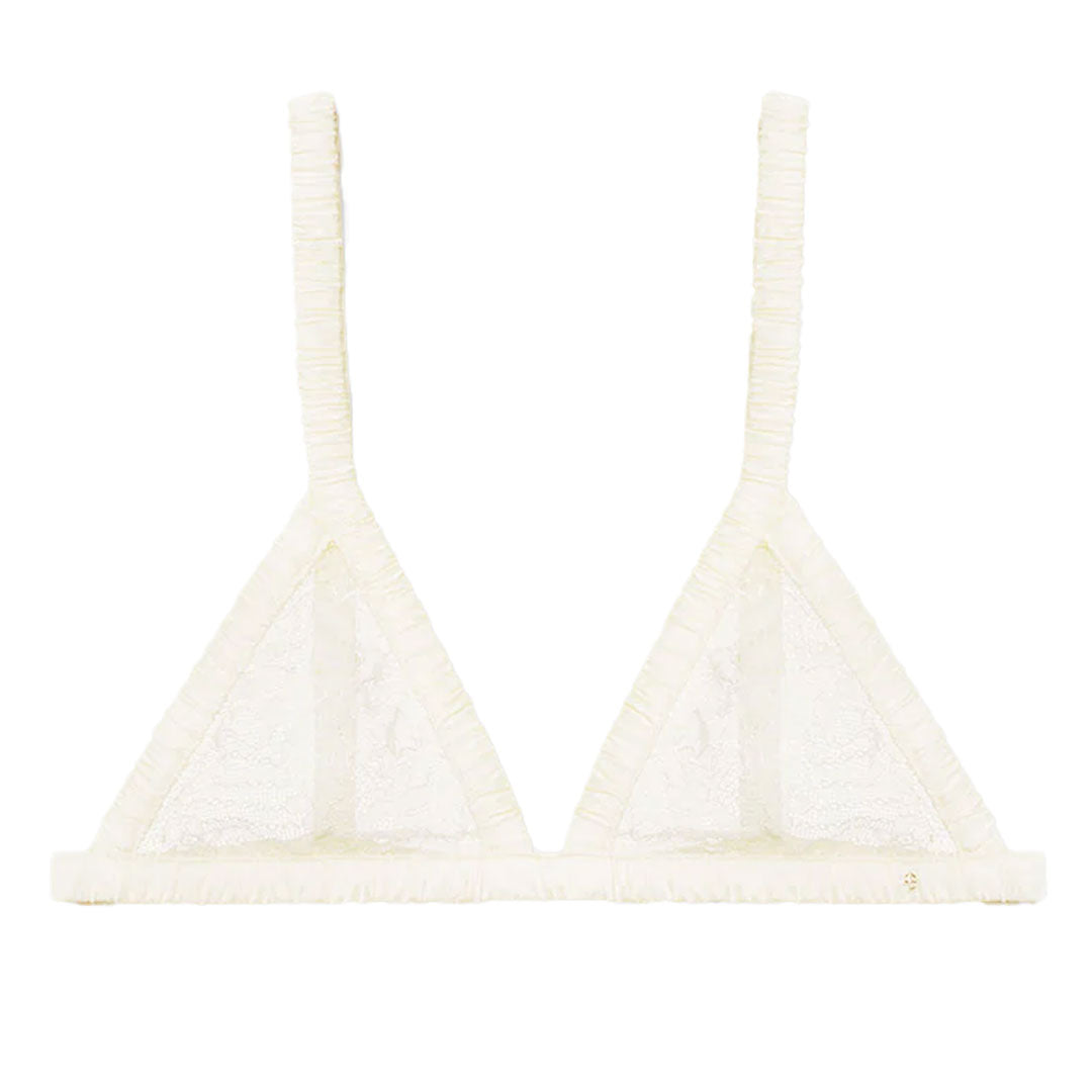 The Lorel Bra is cut from a floral Chantilly lace featuring shirred satin-encased elastic lining with ruched, feminine texture at the underbust, cups, and adjustable straps. Finished with a traditional hook closure at the back for a secure and comfortable fit and a small stitched ANINE BING monogram charm.
