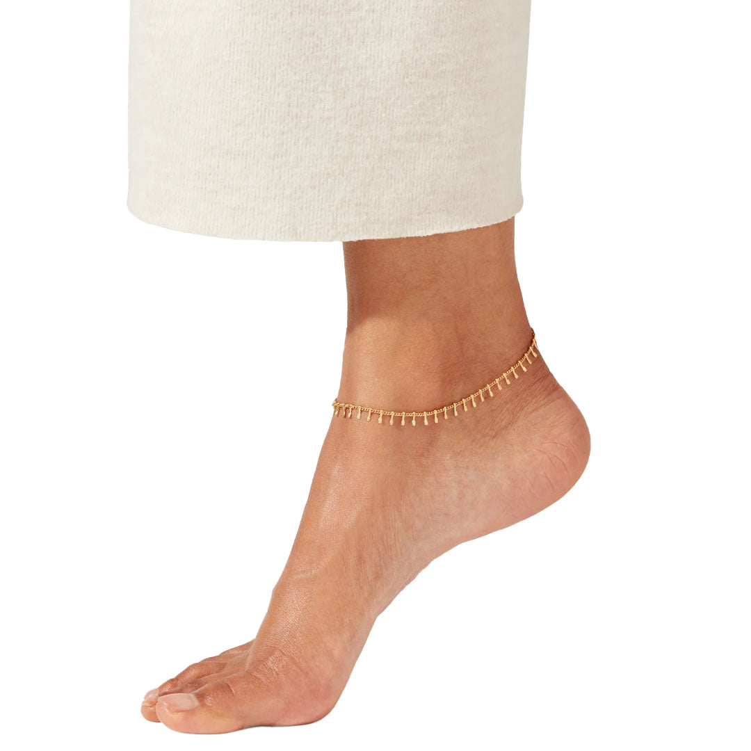 A series of micro stamped elements dangle from a detailed curb chain, catching the light beautifully. The water-durable Lumi Anklet includes three non-removable extender rings, making it easy to adjust to your ideal length. Finished in high-polish gold.