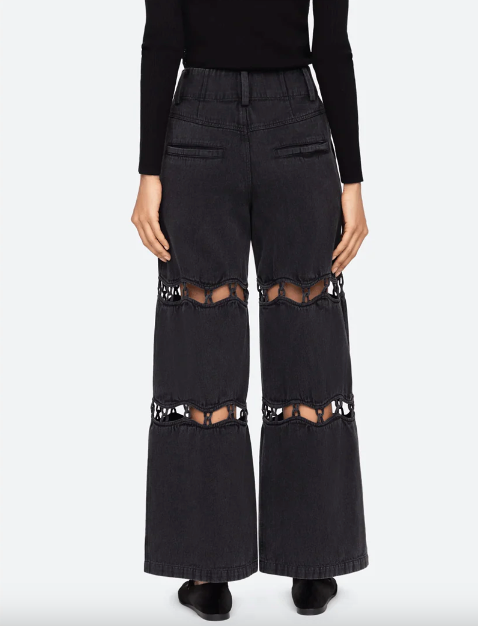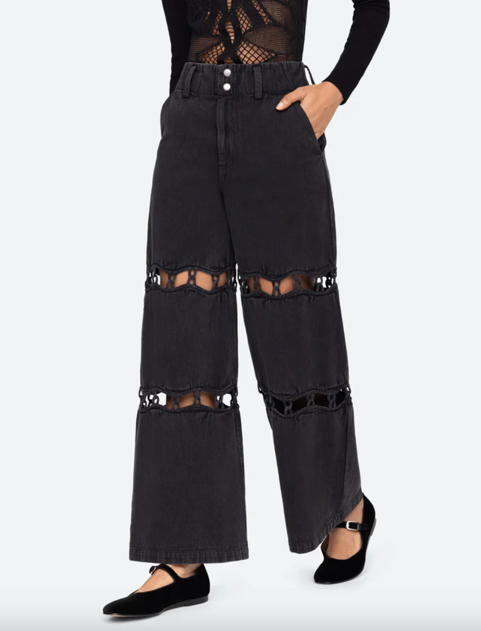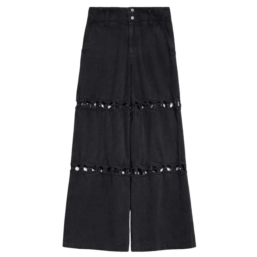 The Luz denim pants feature cutout detailing, high rise waist and wide leg silhouette.