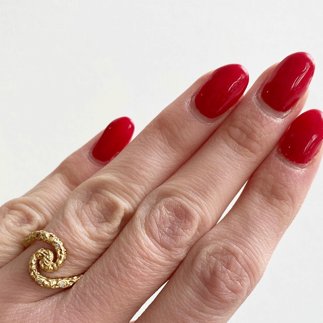 This wave shaped ring is made of 18k yellow gold and scattered with diamonds; either 6 or 20 depending on your preference. It represents eternity as depicted by the ocean.