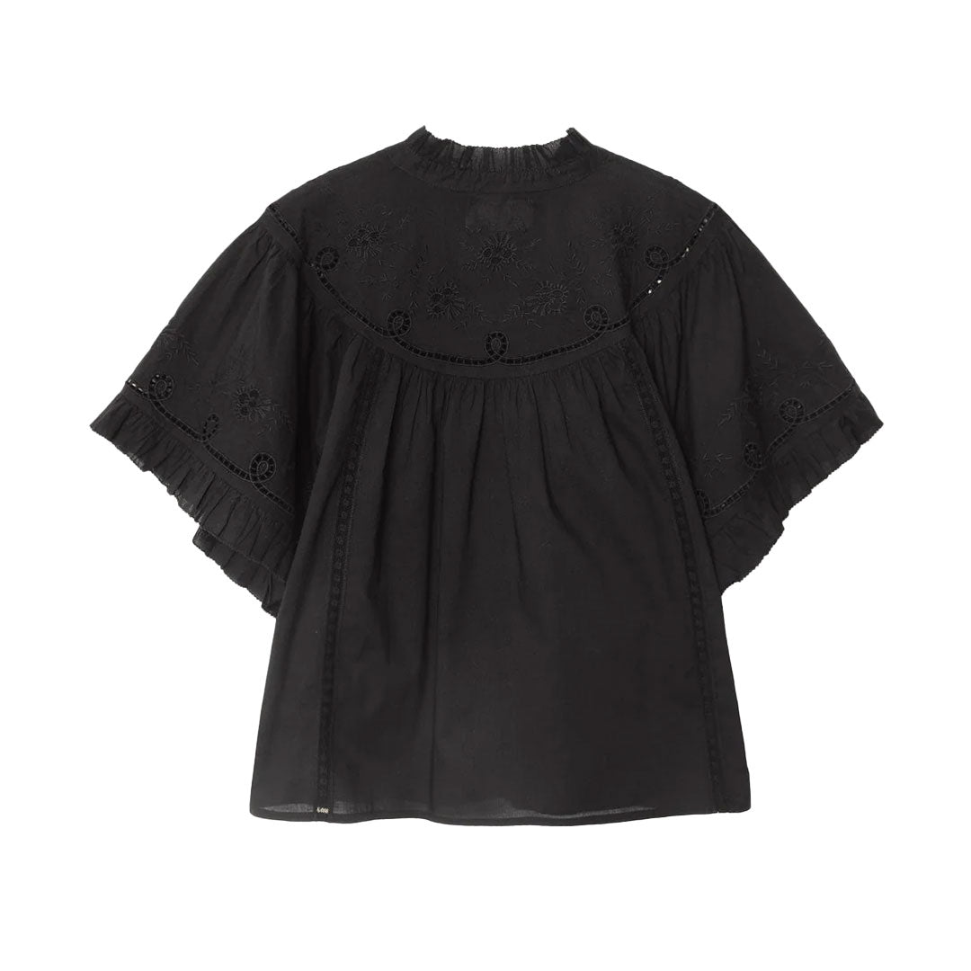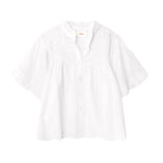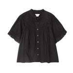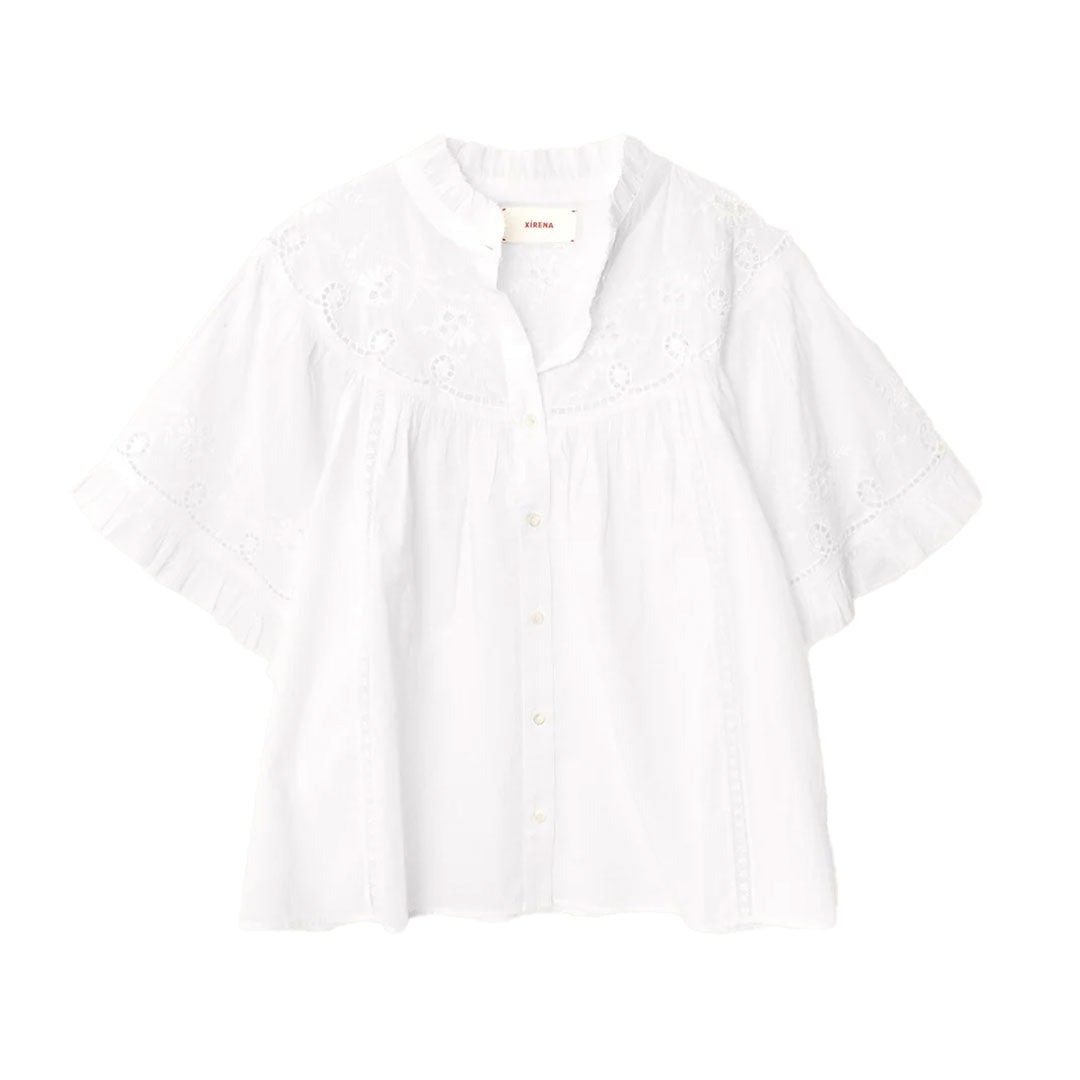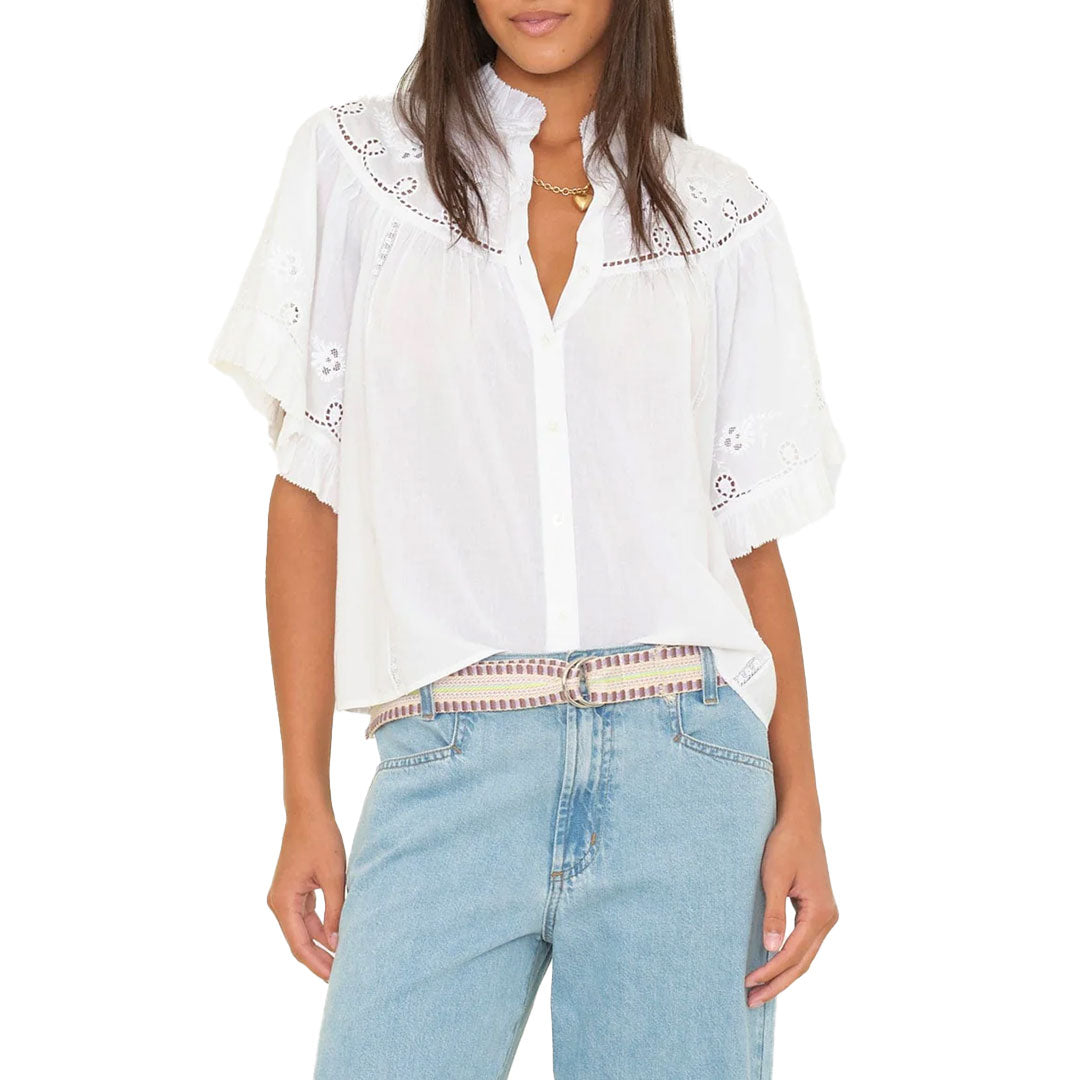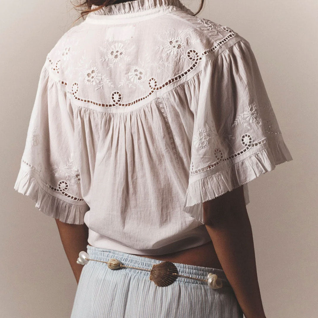 Delicate Details. Mae is new this season in our superfine cotton voile with a soft hand. This ultra-femme button-front shirt features a ruffled collar and sleeve cuffs, finished with intricate embroidery and lace trim throughout.
