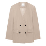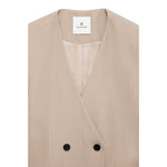 A constructed, collarless blazer in a lightweight, linen-viscose suiting fabrication with a classic oversized fit and double-breasted closure with four horn buttons.