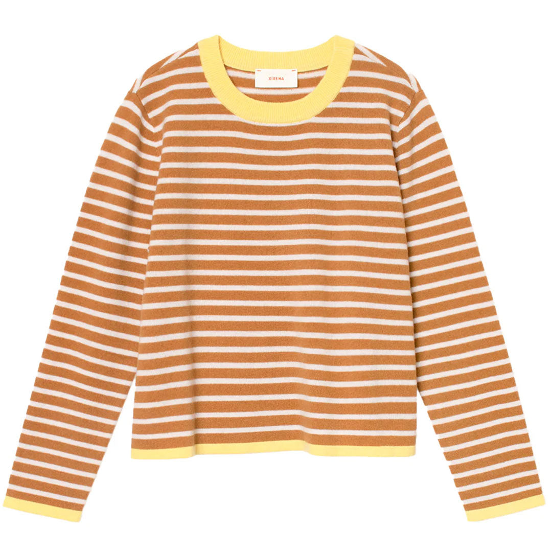 The sporty Maxwell Sweater from Xirena is a laidback style perfect for pairing with your favourite jeans or cords. Crafted from a lightweight wool cashmere blend, this relaxed sweater features a neutral camel stripe and a playful yellow contrasting neckline, hem, and cuffs.