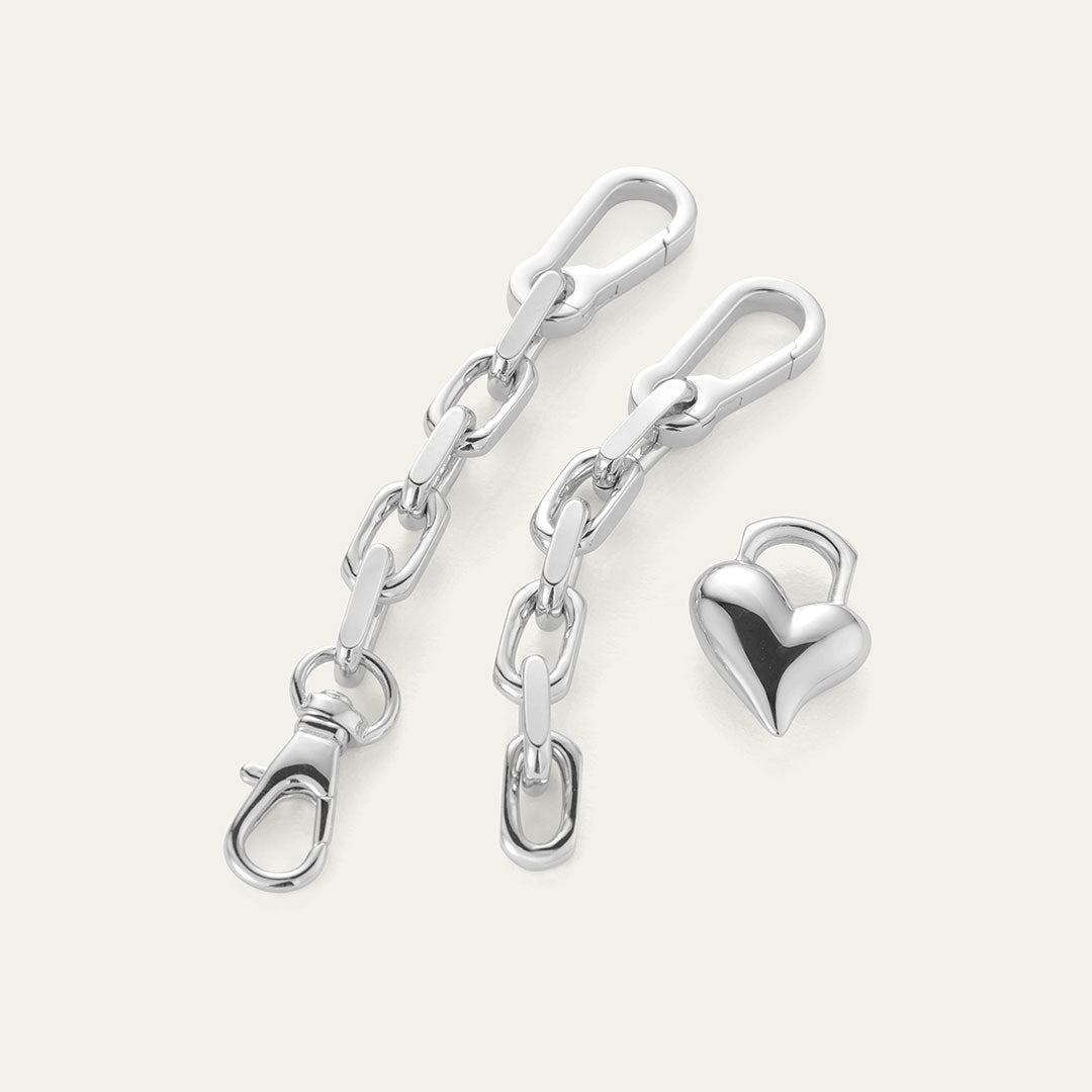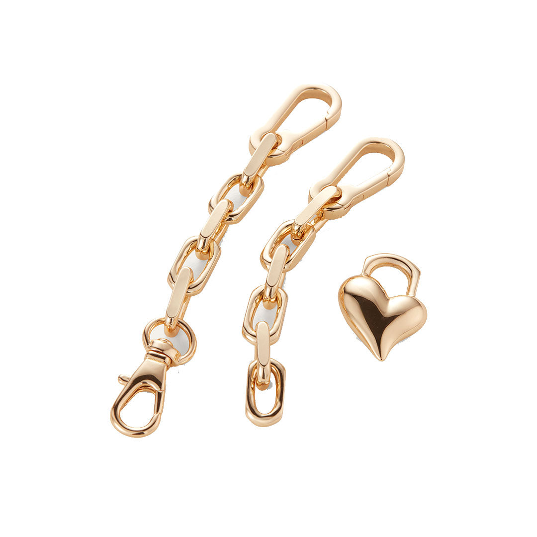 A removable heart is hooked onto crisp, faceted links with small carabiner clasps. The chain can be split in half and used as a small bag charm or keychain. Finished in high-polish gold.