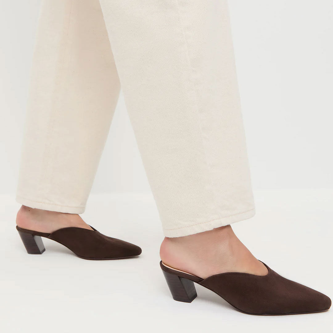 Mid-heel mule in brown suede. Features a kicked heel, pointed toe, and padded footbed with gold stamped logo. 2-inch heel.