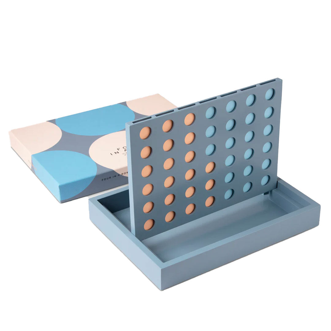 Experience our Play - Four in a Row set, a stylish twist on the classic game, featuring a sober palette and distinct graphics. It is made entirely of lacquered wood, including 42 playing discs (21 of each color), featuring a durable construction that conveniently folds into a compact size.