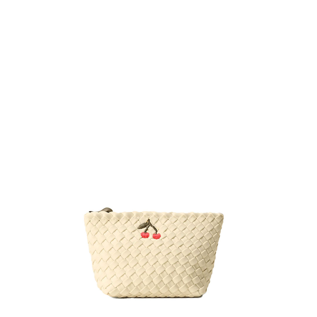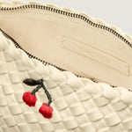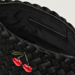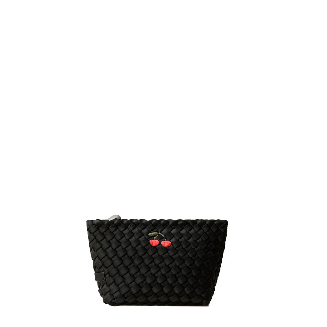 Handwoven neoprene cosmetic pouch with embroidered cherry design