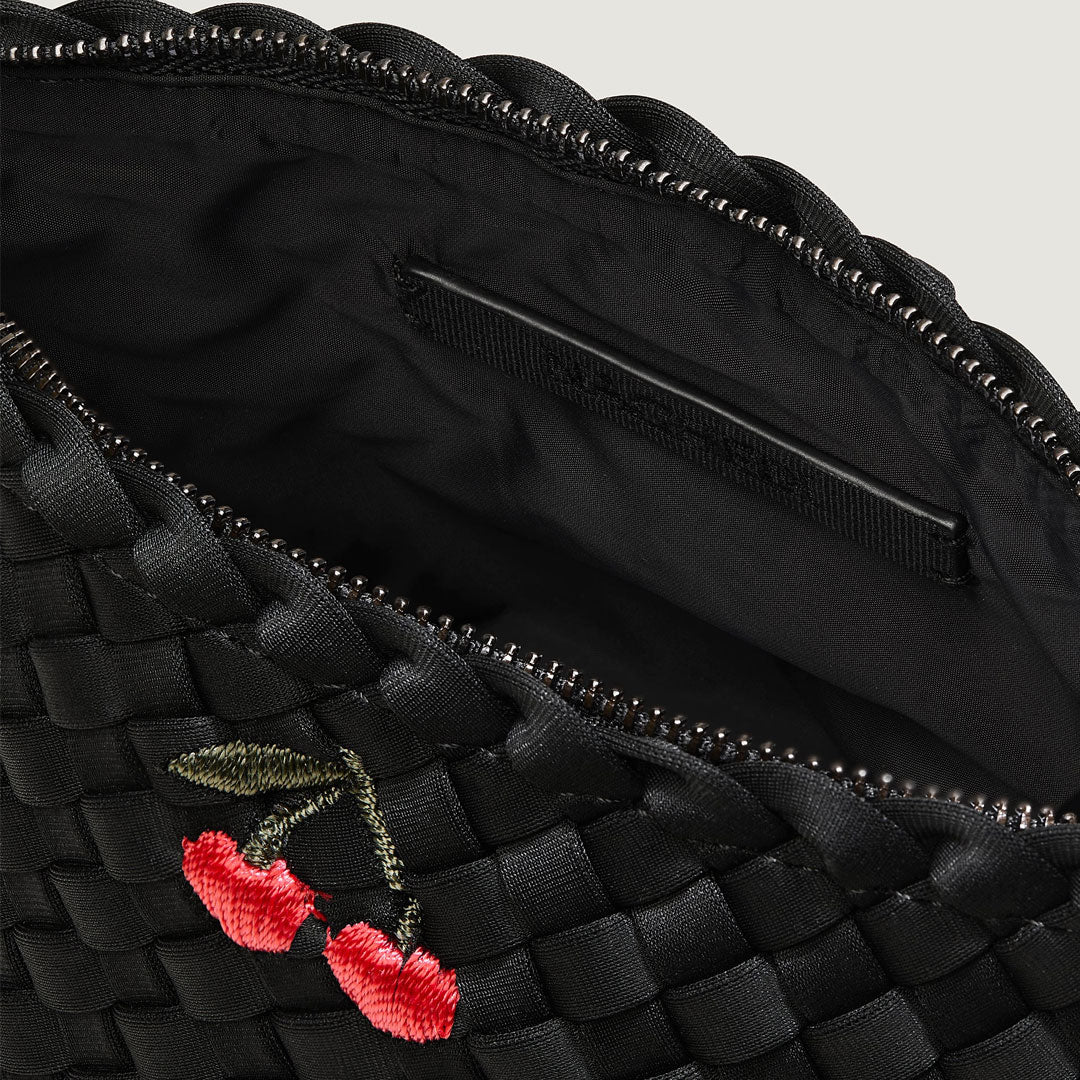 Handwoven neoprene with embroidered cherry detail