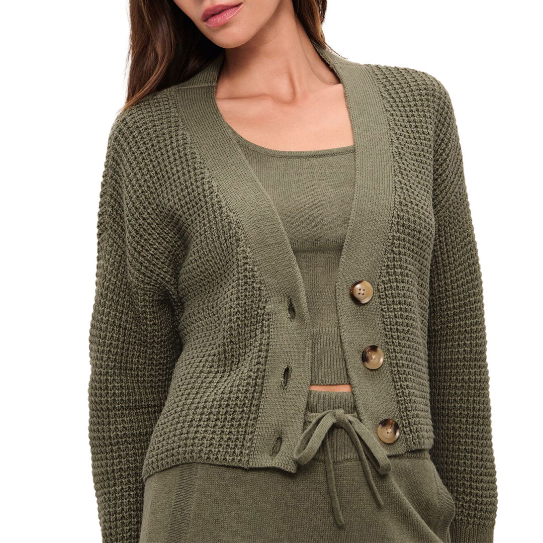 Made from recycled cotton, acrylic, and recycled polyester, this cropped chunky waffle cardigan is a dream to wear and layer with its relaxed fit and button closure. Pair with the matching sweater pant and cropped tank for an all day outfit, or gift the full set to your favorite person who loves softness (and the planet) just as much as you.