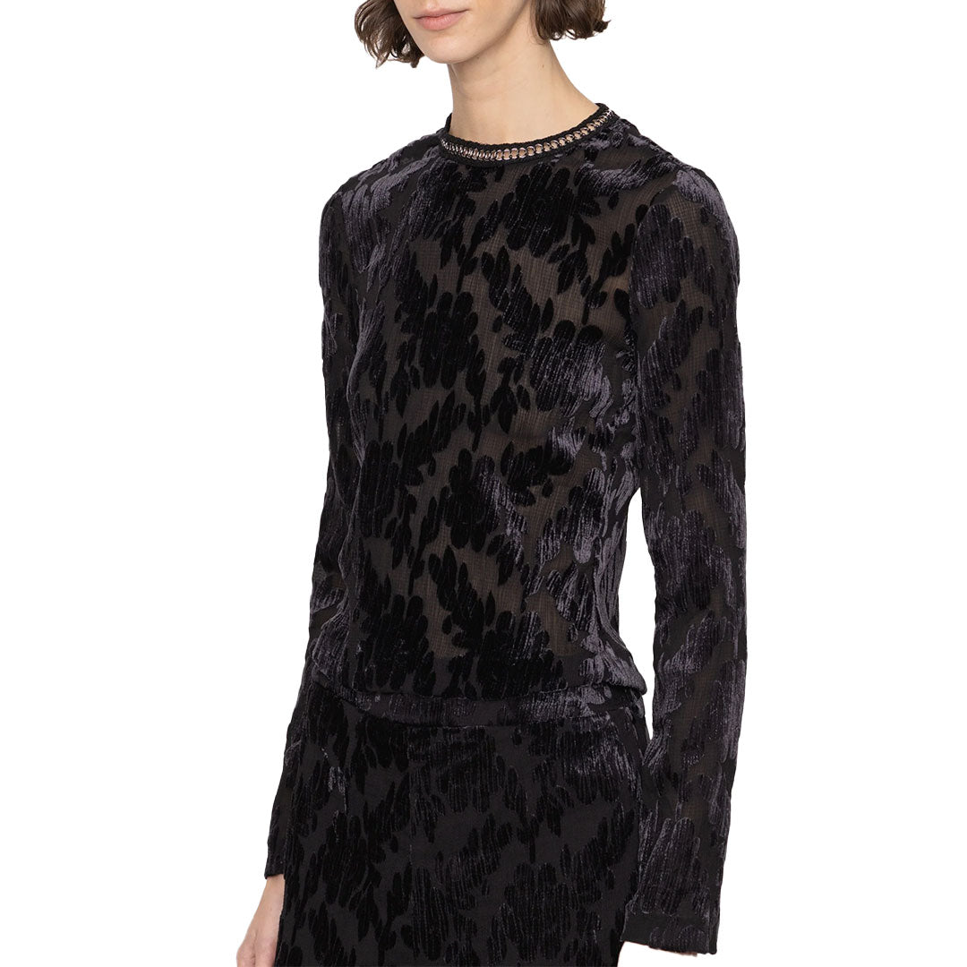 The Regine floral burnout velvet long sleeve turtleneck features a refined high neckline, slim sleeves, and a flattering silhouette. Subtle metal chain accents lend a contemporary edge to its sophisticated design.