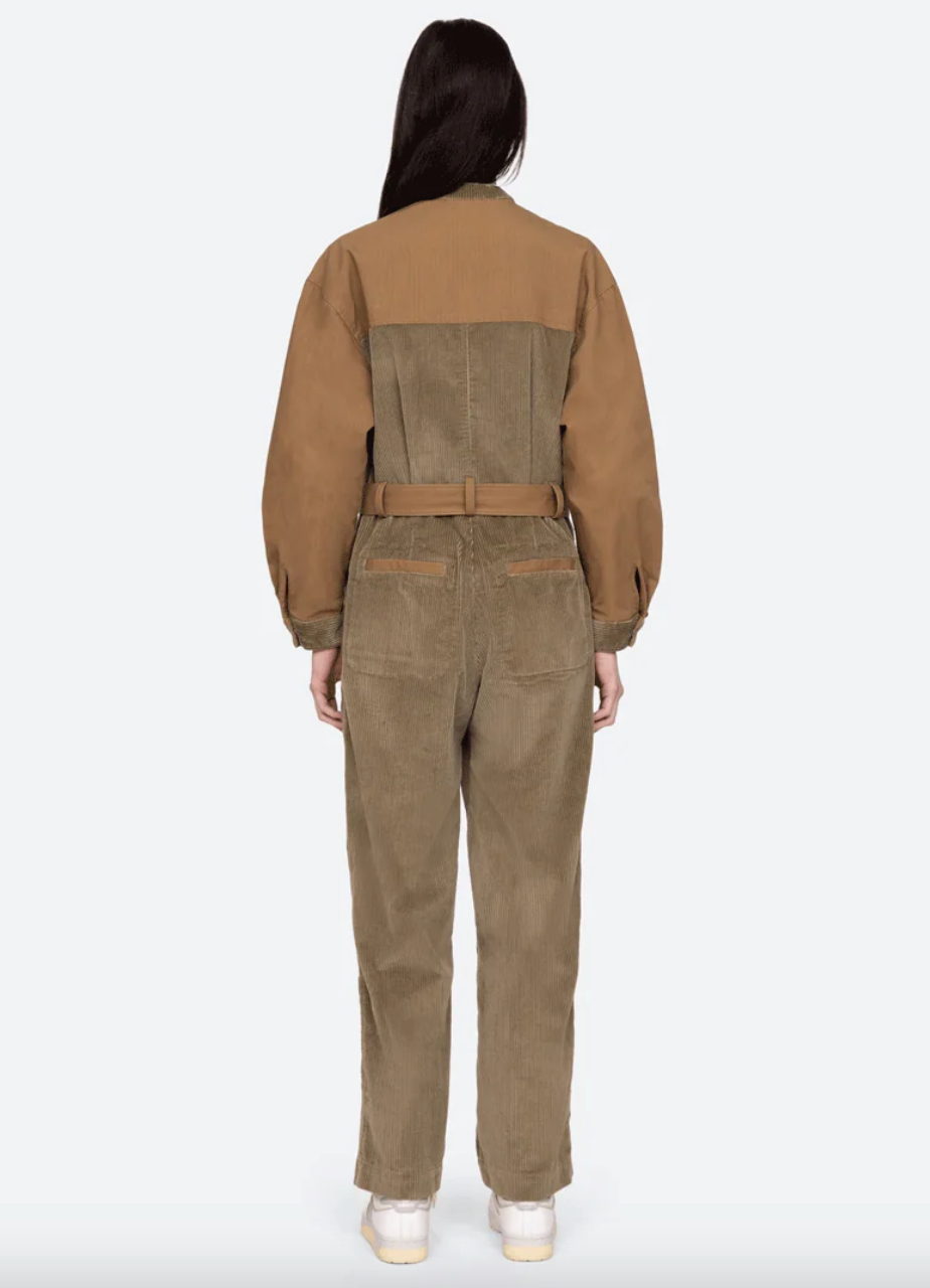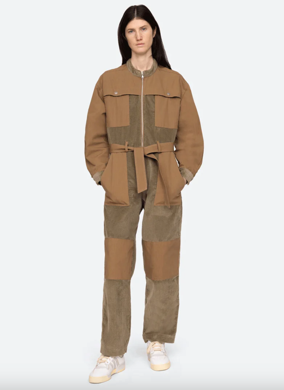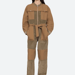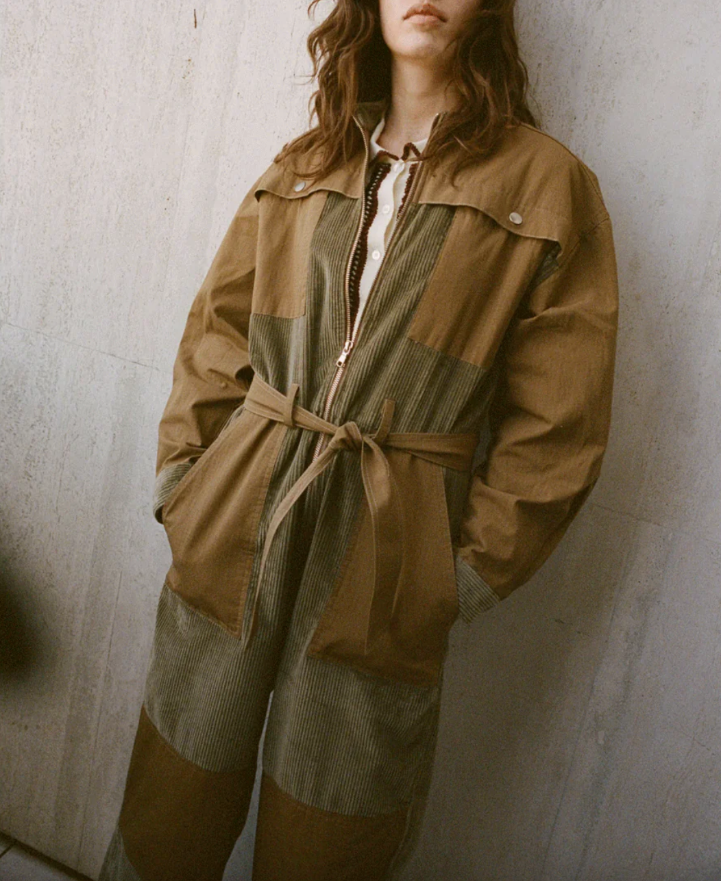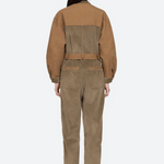 The Riba combo jumpsuit features ripstop and corduroy throughout, self tie belt, and exposed front zipper. Designed for an easy, relaxed fit.