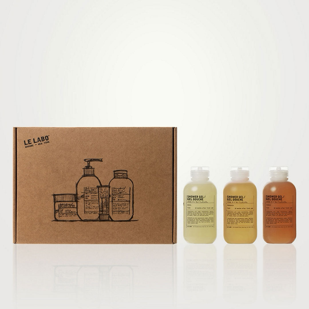 Some things are better together… a trio of Le Labo's shower gels. Comes in a kraft gift box. Basil is paired with verbena, a citrusy and vegetal aromatic note, increasing each facet of basil. The Hinoki scent is inspired by the Buddhist temples of Mount Koya in Japan, where the mystical, profusely warm, mesmerizing scent of hinoki trees emanates from the surrounding forest. The Mandarin scent offers a sparkling start, and fuses with notes of geranium for even more freshness.