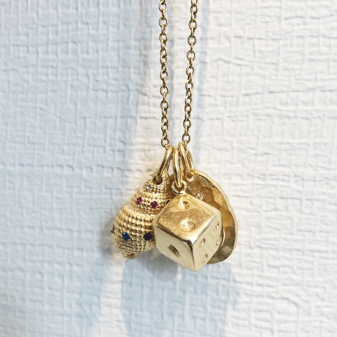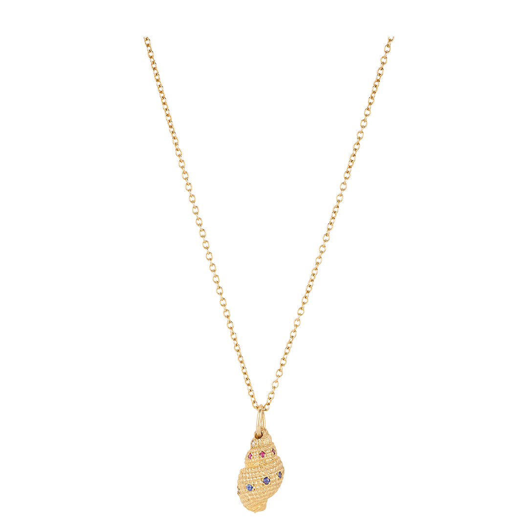 Kaja found this shell on a morning walk on the beach in Southampton this summer, and wanted to preserve it by casting it in 18k yellow gold. The inset gems can be customized on each order as desired.
