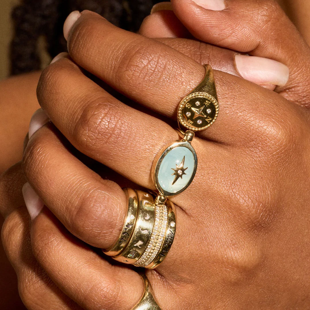 Inspired by spinning heritage rings of days past, Zahava has created rings and pendants that spin to reveal an engraving on the back.