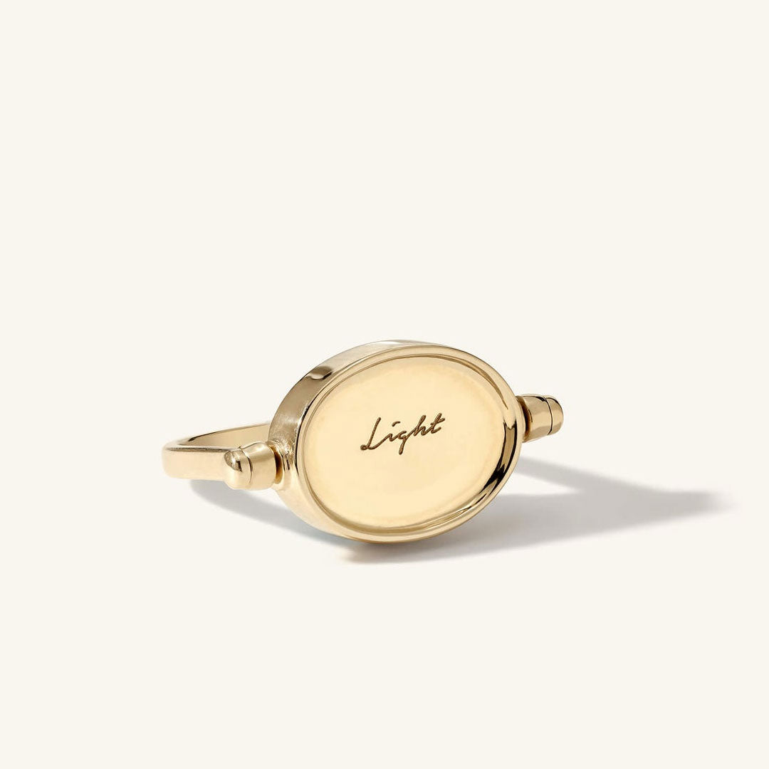 This spinning Ruby ring showcases our classic Star on the front and reveals the word "Light" engraved on the back.