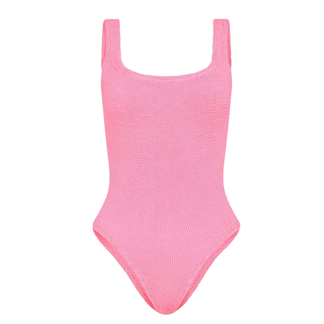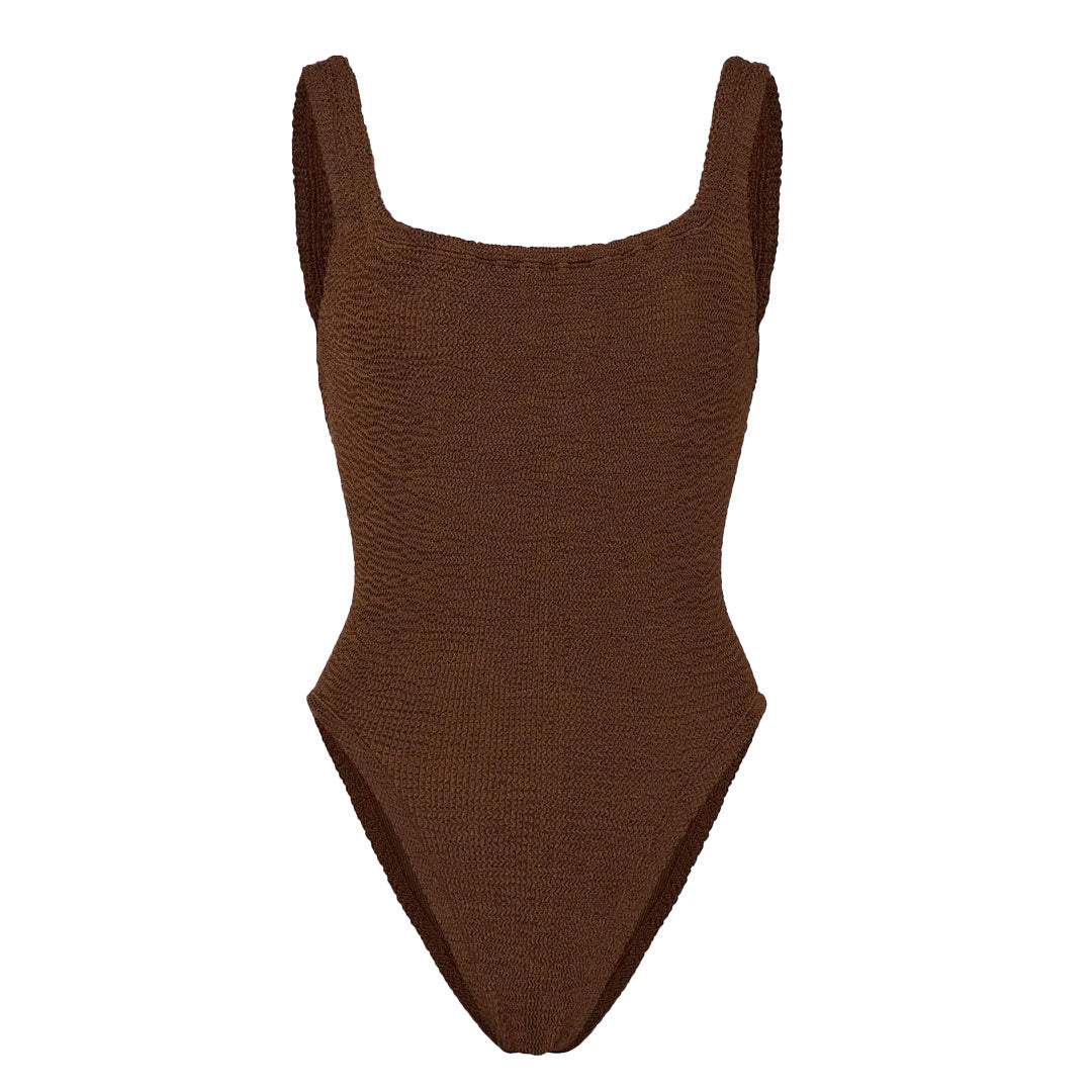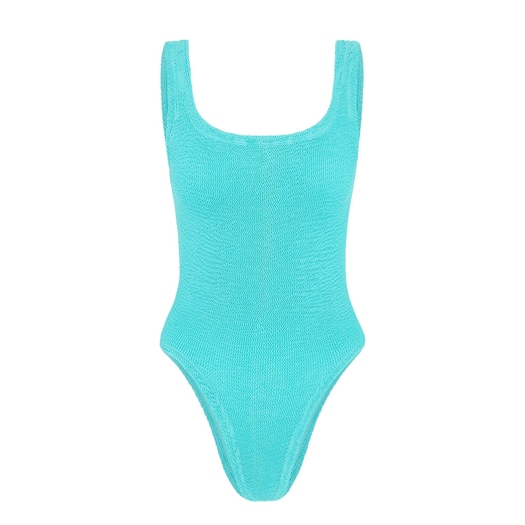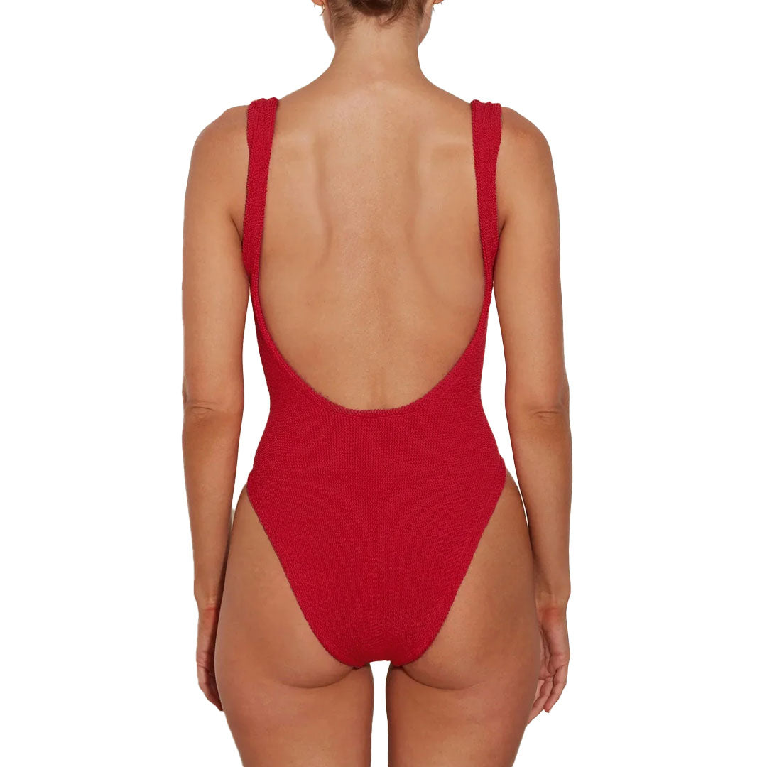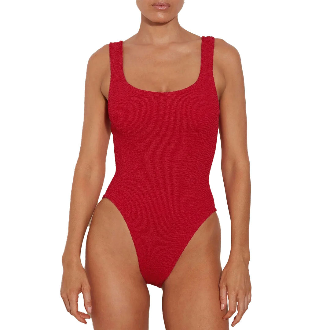 Hunza G's one-piece swimsuit is made from a sculpting seersucker fabric that molds to enhance your curves. It has a low scooped back and a high-cut leg. poolside look.