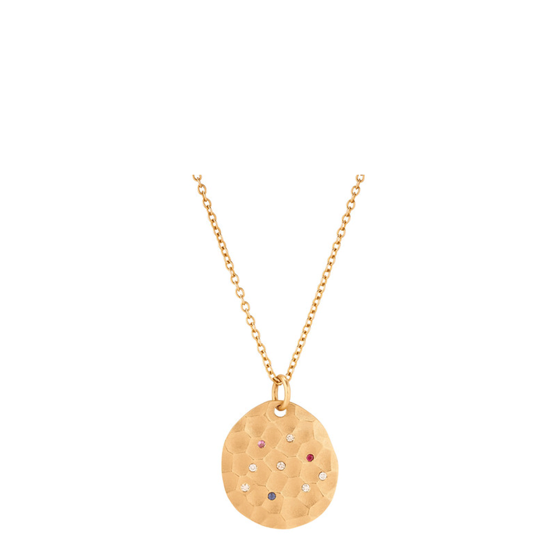 This pendant is made of 18k yellow gold. It is inspired by spontaneous adventures and close friendships that span continents. Wear it as a reminder to always count your lucky stars, and customize the 8 inset gems to be the birth stones of people you care about.