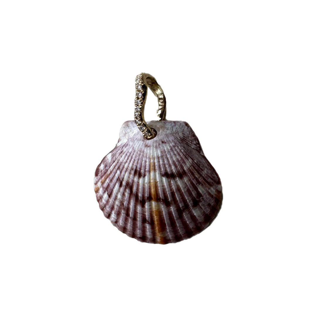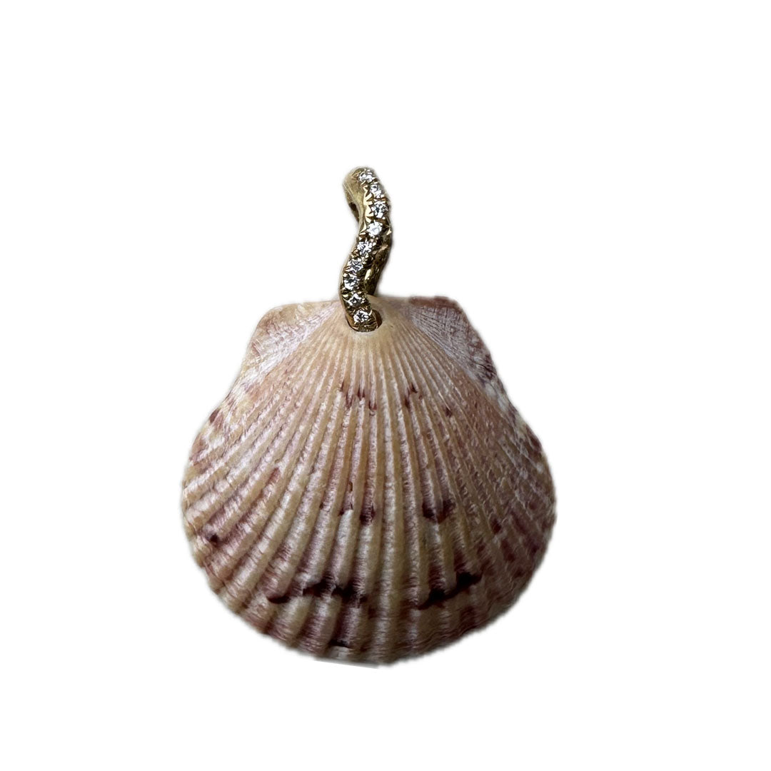 The Tahiti shell pendant is designed with an 18K yellow gold bale inset with 10 diamonds. Each shell is slightly different, with a patina that will change over time.