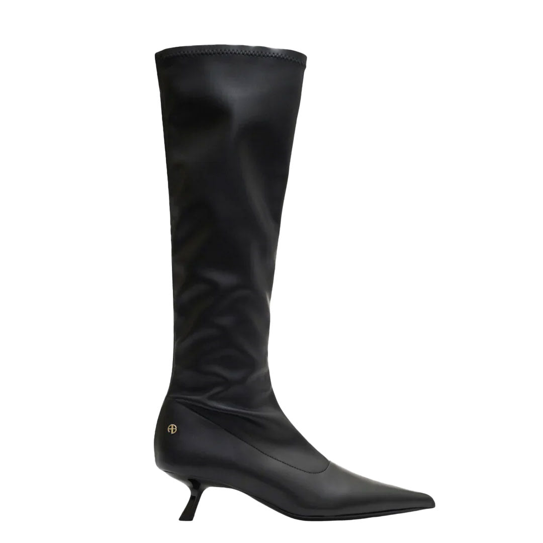 Modern sock booties made from stretch vegan leather with a slight sheen. The Hilda Boots' sleek construction features a sharp pointed toe, low slanted heel, and high-shine outsole. Accented with gold-tone Anine Bing hardware at each heel.