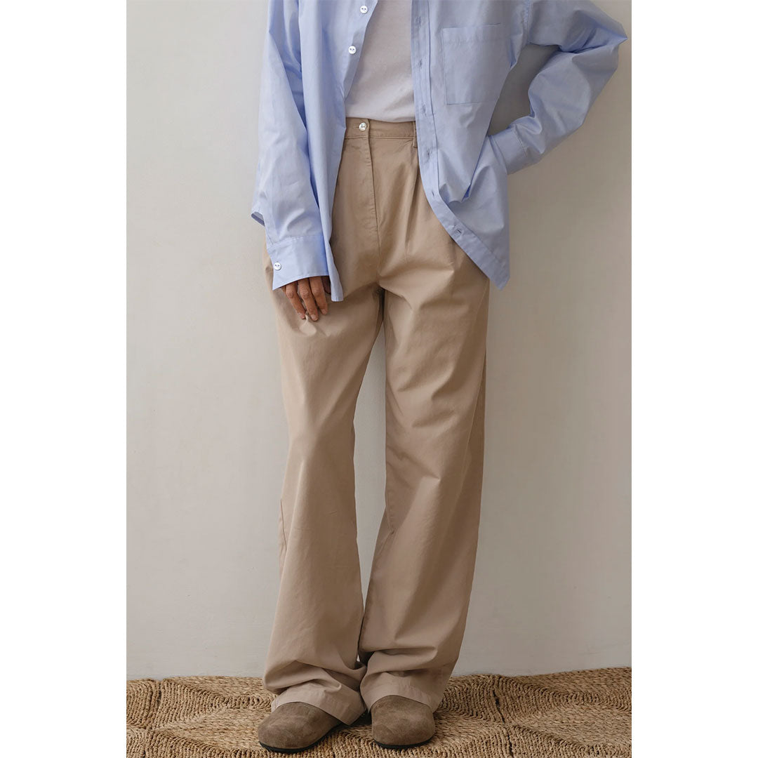 A refined staple with a relaxed sensibility. The Chino Pleated Trouser is crafted from 100% cotton and features front pleats, a full-length silhouette, and a mother-of-pearl button closure. Designed with belt loops and functional side and back pockets, it offers a structured yet comfortable fit with a perfectly broken-in feel.