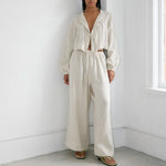 Boheme's trouser goes with everything and is a nod to 90's simplicity with an elasticated waist. Roll the waist band for a shorter length.