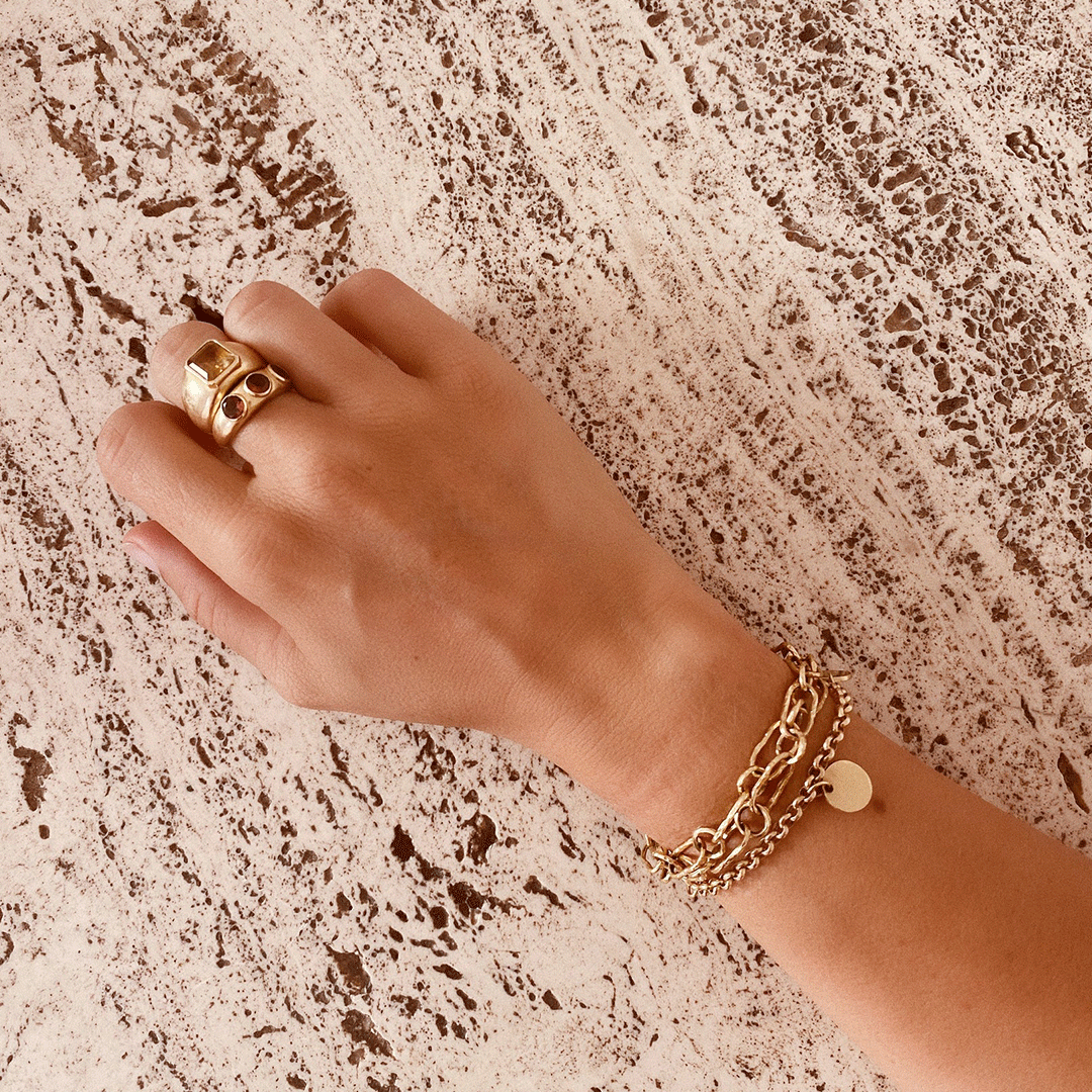 This 18k yellow gold ring is a statement piece which can be worn either alone or in combination with the Octo ring. It features one large bezel set gemstone of your choice, and comes with a brushed finish.